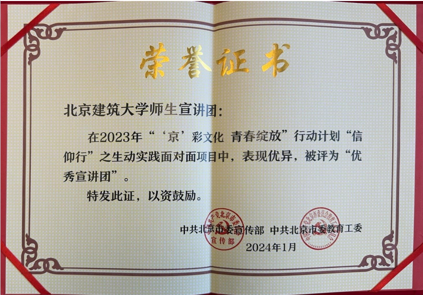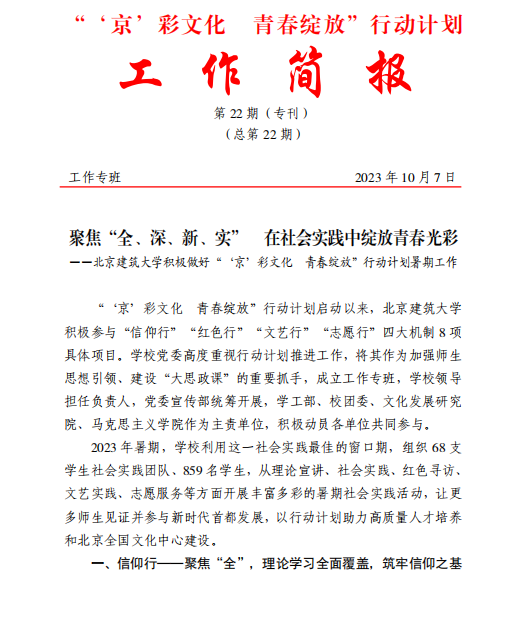 5月23日,在“‘京’彩文化,青春绽放”行动计划开展一周年之际,北建大召开“‘京’彩文化,青春绽放”行动计划工作推进会。会议对行动计划2023年工作进行全面总结,对2024年工作作出总体部署。党委副书记王逸鸣,党委常委、副校长朱静,党委常委、宣传部部长魏楚元,宣传部、学工部、文发院、国发院、校团委、马院相关人员参加会议。 王逸鸣对学校“‘京’彩文化,青春绽放”行动计划2023年取得的成绩予以肯定。他指出,“‘京’彩文化,青春绽放”行动计划2024年工作已全面展开,要高度重视,提高站位,充分认识到行动计划是学习贯彻习近平文化思想的具体举措和生动体现,强化思想旗帜引领,多开展师生喜闻乐见的活动;秉承校训精神,追求精益求精,高标准做好各项工作;加强统筹协调,各部门齐心协力,形成有效工作合力;不断总结经验,凝练特色,争创行动计划建大品牌。 朱静表示,2023年,学校“‘京’彩文化,青春绽放”行动计划得到有力推进。2024年,行动计划在运行一年的基础上全面提质升级,并列入市委教育工委宣传教育工作重点任务,项目更多、任务更重,学校要全力组织好相关活动。要将行动计划充分融入五育融合体系,大力推进以文化人、以文润心;与“大思政课”建设统筹推进,更好培养时代新人。各部门相互协作,确保在2023年工作基础上进一步做实做细,努力取得更大成绩。 会上,宣传部对学校“‘京’彩文化,青春绽放”行动计划工作开展情况进行总体汇报,相关部门交流发言,一起对2024年重点工作进行分析和展望。 BUCEA ? ? ? ? 2023年,北京市委宣传部、市委教育工委联合开展“‘京’彩文化,青春绽放”行动计划,我校是这一行动计划的首批试点高校之一。作为高水平特色型高校、市属唯一建筑类高校,学校高度重视行动计划实施,把行动计划作为青年学生思想引领的重要载体、文化育人的重要途径,积极有序推进所承担的“信仰行”“红色行”“文艺行”“志愿行”的各项活动顺利开展,充分发挥行动计划育人作用,推动以文化人,在服务北京全国文化中心建设中展现建大学子风采。 日前,市委宣传部、市委教育工委颁发相关表彰决定。我校获评2023年“‘京’彩文化,青春绽放”行动计划优秀组织奖,同时还获得多项单项奖励。 在“信仰行”中,全国劳动模范吴喜军、刘玉坤等榜样人物、百姓宣讲员走进校园,与同学们面对面交流。“时代楷模”曲建武等理论名家与学生共话成长、畅谈青春。各学院组织14支团队先后走进平谷区农业中关村、首钢园等新时代首都发展标志地打卡参观和实地调研,体悟党的创新理论在京华大地的生动实践。党委宣传部大力指导学生理论社团“先锋社”,开展读书交流、实践研学等活动,在“‘理’赞青春”——优秀读书心得、优秀调研报告、优秀理论文章评选中,同学们获得一等奖1篇、二等奖1篇,三等奖5篇。宣传部会同马院组建“师生进基层宣讲团”,赴大兴、石景山两区10个街道、社区基层开展宣讲,让党的创新理论“飞入寻常百姓家”,宣讲团获评“生动实践面对面”优秀宣讲团,马院吕天石老师、梁丽媛同学荣获优秀宣讲员。学校代表队获“信仰行”新时代党的创新理论知识竞赛团体第三名。创新开设“北建大理赞青春”微信公众号,把公众号建设成为促进师生理论学习、理论交流、理论传播的网上阵地。 在“红色行”中,党委宣传部会同各学院组建多支团队走进北京市内的红色纪念场馆、纪念园(碑)、遗址遗迹、红色名人故居、红色文物等红色印迹进行拍摄,开展红色打卡宣介、革命文物介绍等创作,讲述红色故事、红色记忆,用行动诠释红色基因的新时代内涵。在“我的红色记忆”随手拍微视频征集展示活动中,学生作品获得多项奖励。 在“文艺行”中,“北京交响乐团北京建筑大学专场音乐会”“中国杂技团北京建筑大学专场展演”等活动一次次掀起校园文化活动的高潮,受到学生广泛欢迎。《志愿军·雄兵出击》影片走进北建大,带领师生重温那段波澜壮阔的岁月。校团委组织师生观演《人民的非遗》主题展览与专场音乐会、古琴文化展与专场音乐会、音乐剧《理想之城》等,现场体验文化大餐;与北京市文联合作开展“舞台艺术系列培训课程”,助力有舞台梦想和才华的学生勇于在更大的舞台闪亮绽放。系列丰富的文化活动提升校园文化水平,涵养学生心灵,厚植人文情怀。学校获评“大戏看北京2023展演季”优秀组织单位。 在“志愿行”中,北建大50名志愿者以饱满的热情、挺拔的身姿、自信的微笑、专业的服务在第三届“一带一路”国际合作高峰论坛贡献建大学子力量,获得多方点赞与好评。学校72名师生圆满完成北京大兴半程马拉松暨第七届“花绘北京 悦跑大兴”半程马拉松赛的志愿服务工作,展现了首都高校青年蓬勃向上的精神风貌。52名北建大志愿者和52名大兴区小学生“一对一”云结对,开展“在线云支教”活动。校团委还组织志愿服务队参加“书香未来”志愿行阅读季等志愿服务活动,青春在志愿服务中迸发熠熠光彩。多名学生在重大活动中获评“优秀志愿者”。 “京”彩文化,青春绽放,接力出发。目前,2024年“‘京’彩文化,青春绽放”行动计划已全面启动。今年的行动计划“菜单”更加丰富,形式更加多样,机制更加优化,学校的活动项目扩展到“信仰行”