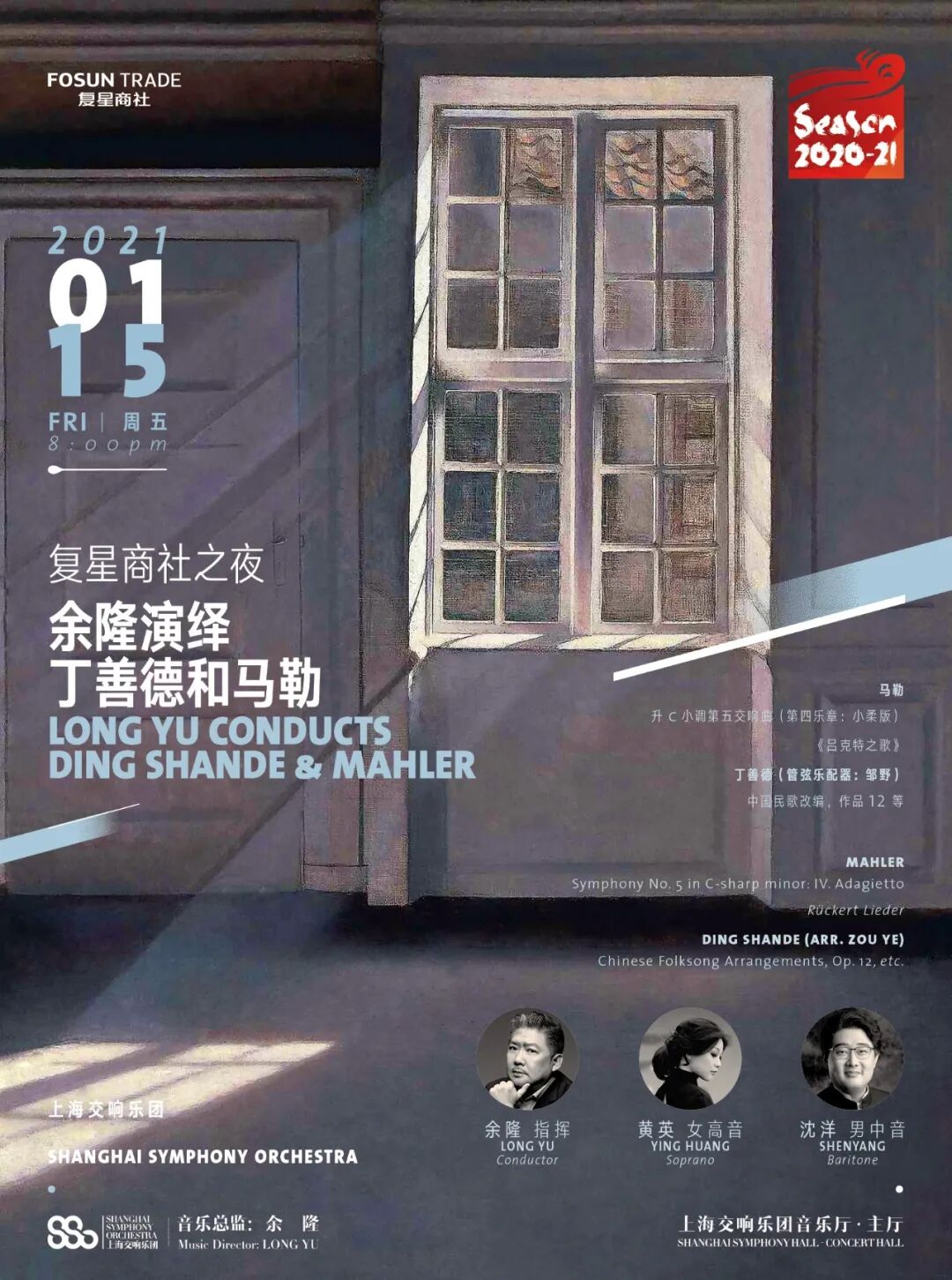 此次音乐会的所有声乐作品均以交响乐队伴奏。1月15日,让我们相约上海交响乐团2020-21音乐季乐队音乐会,聆听丁善德和马勒两位大师的声乐作品,探寻中西艺术交融的诗歌意境。