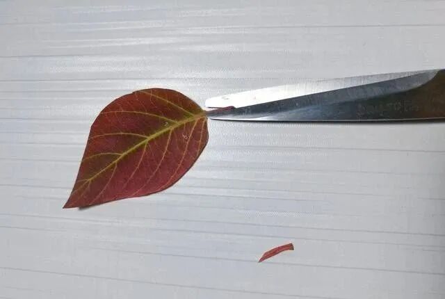 再修剪叶柄,剪短一点,把端点剪成尖的形状,当小鸟的嘴