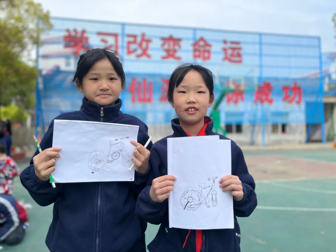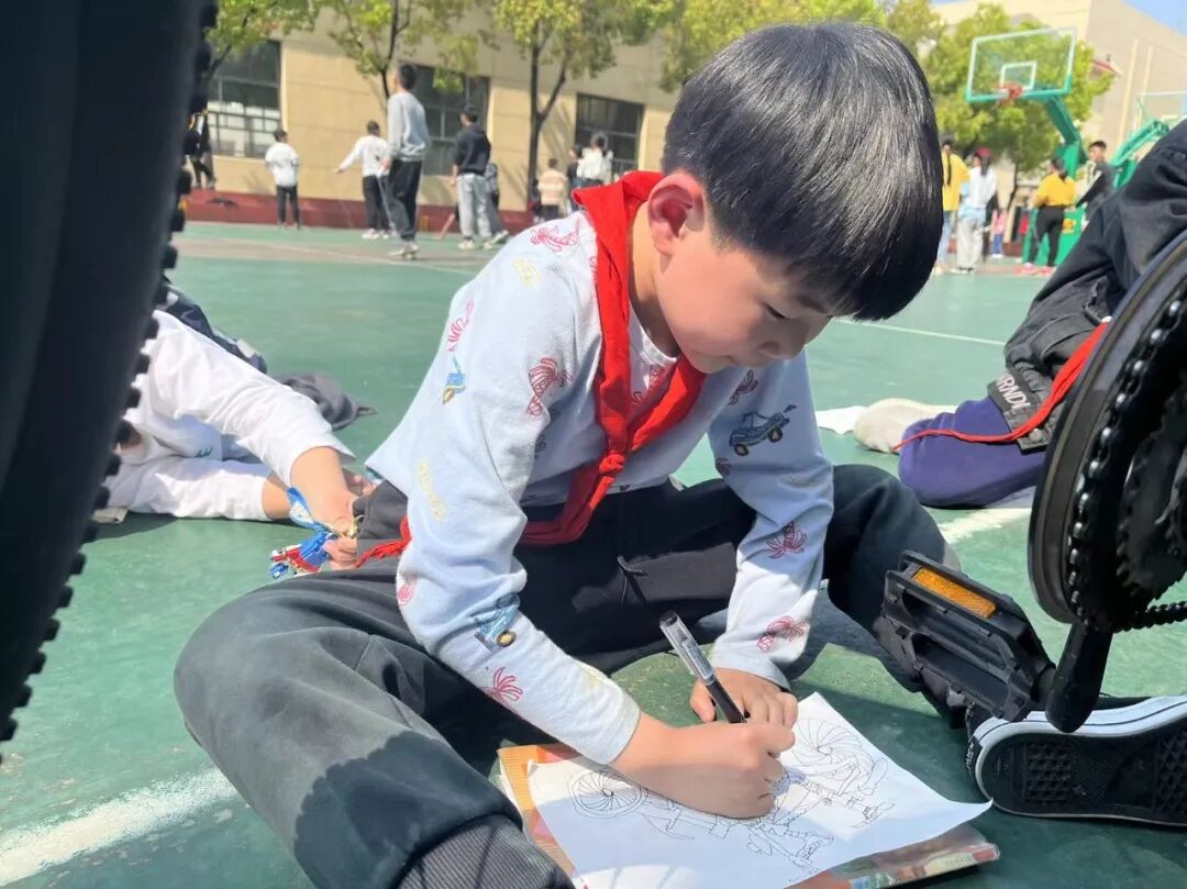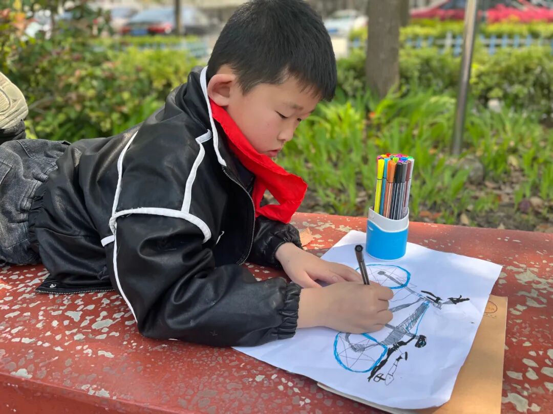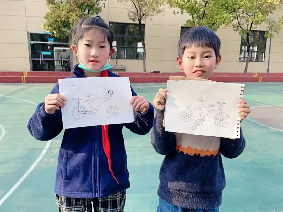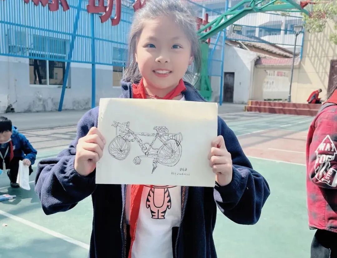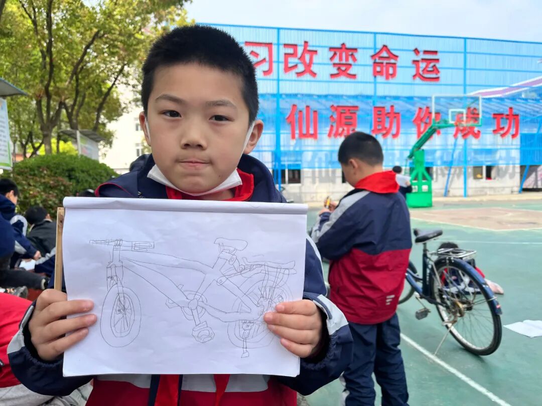 通过对自行车的局部精细地观察,然后进行线条的表现,看!同学们的作品,在提高学生的观察能力的同时又提升了同学们线条的造型能力。 看我们多认真.... 认真的观察,细致的描绘。 通过这样的一节美术课让学生感受到创作的乐趣,充分调动了他们的艺术潜能。![]()