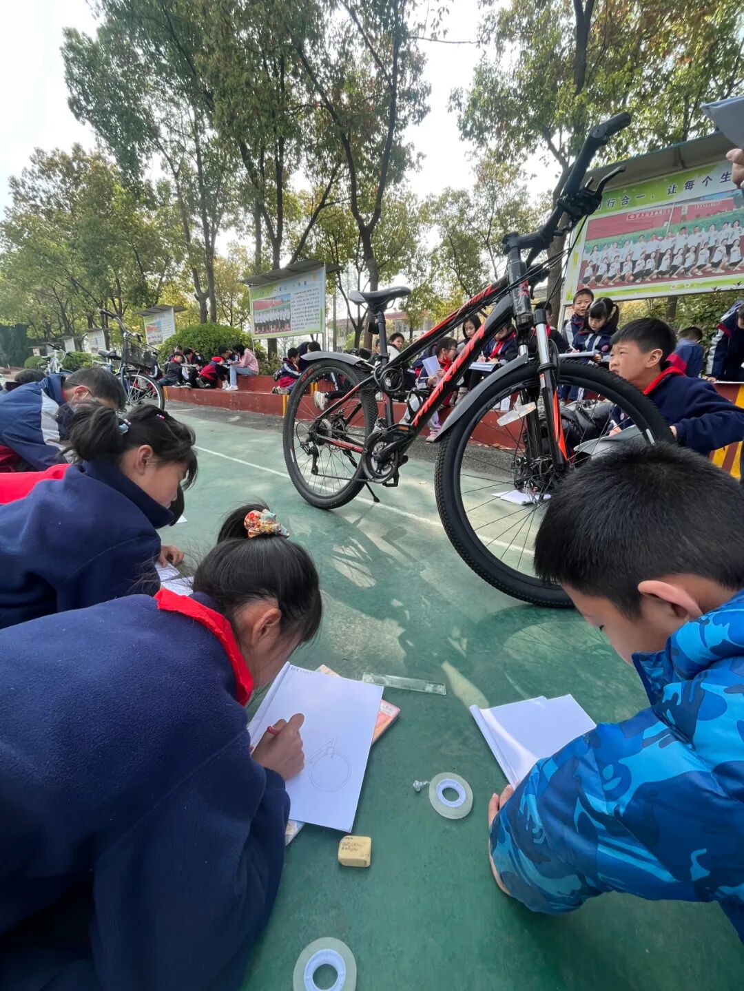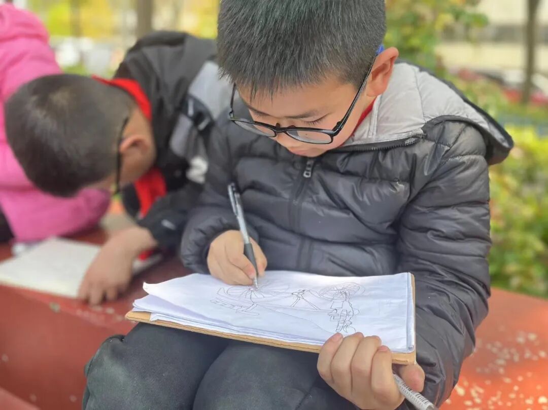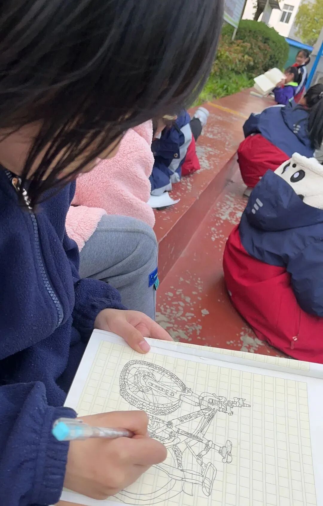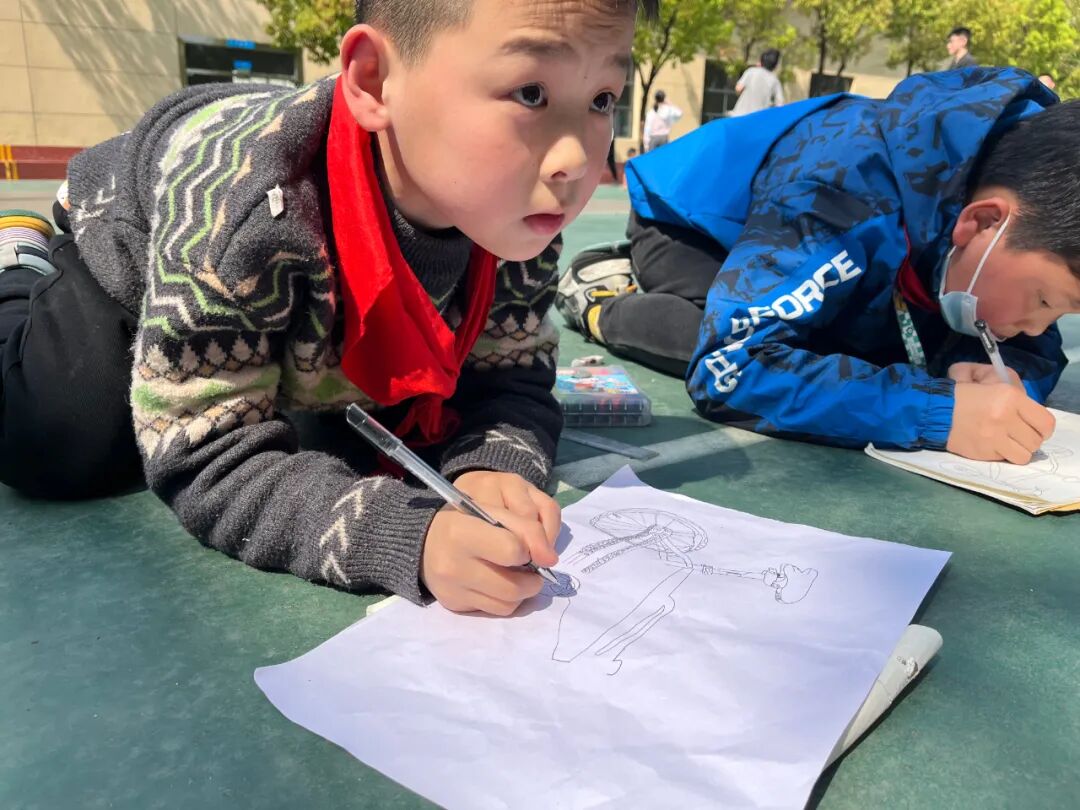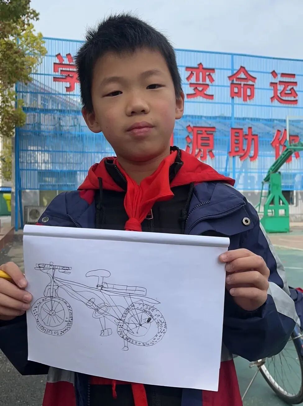 通过对自行车的局部精细地观察,然后进行线条的表现,看!同学们的作品,在提高学生的观察能力的同时又提升了同学们线条的造型能力。 看我们多认真.... 认真的观察,细致的描绘。 通过这样的一节美术课让学生感受到创作的乐趣,充分调动了他们的艺术潜能。![]()