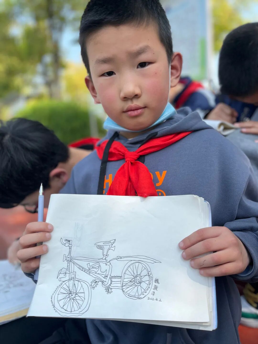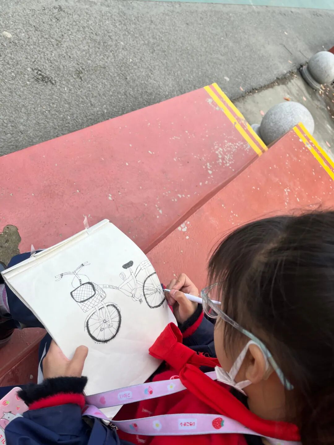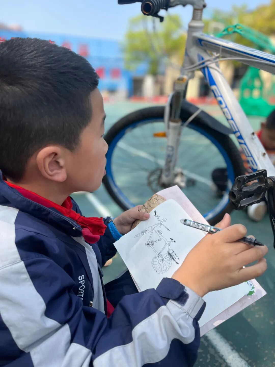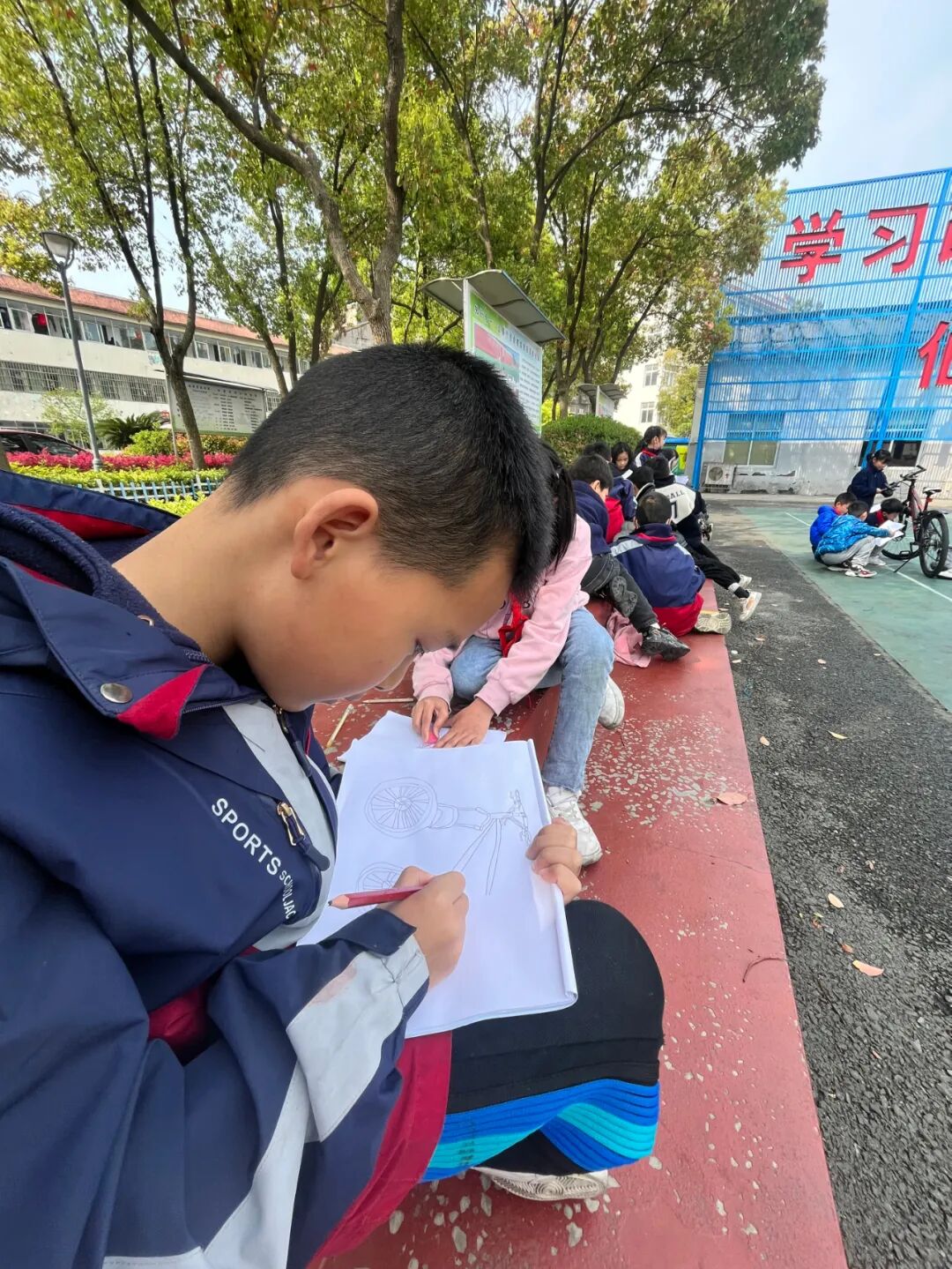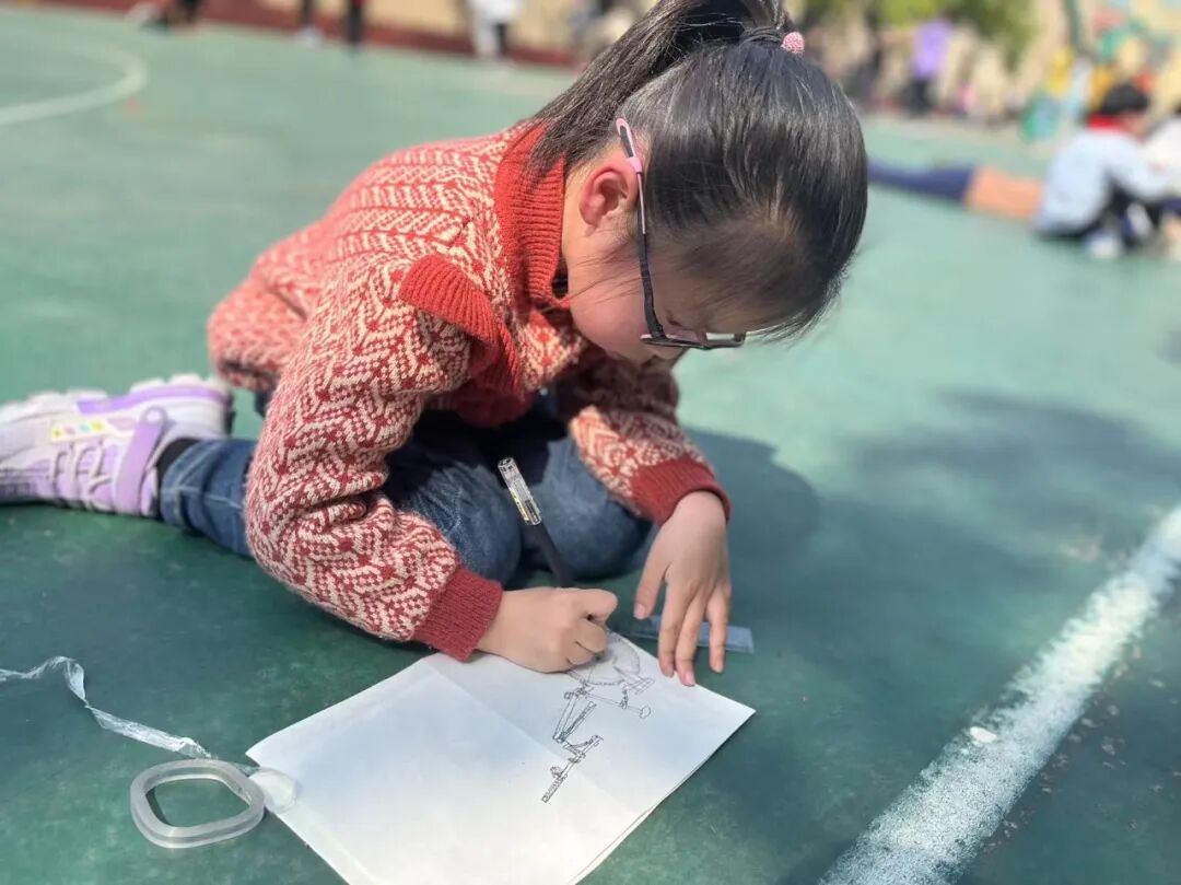 通过对自行车的局部精细地观察,然后进行线条的表现,看!同学们的作品,在提高学生的观察能力的同时又提升了同学们线条的造型能力。 看我们多认真.... 认真的观察,细致的描绘。 通过这样的一节美术课让学生感受到创作的乐趣,充分调动了他们的艺术潜能。![]()