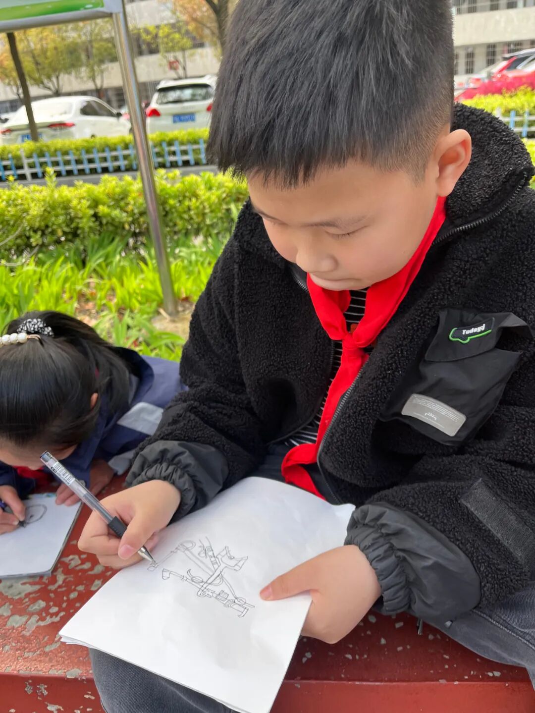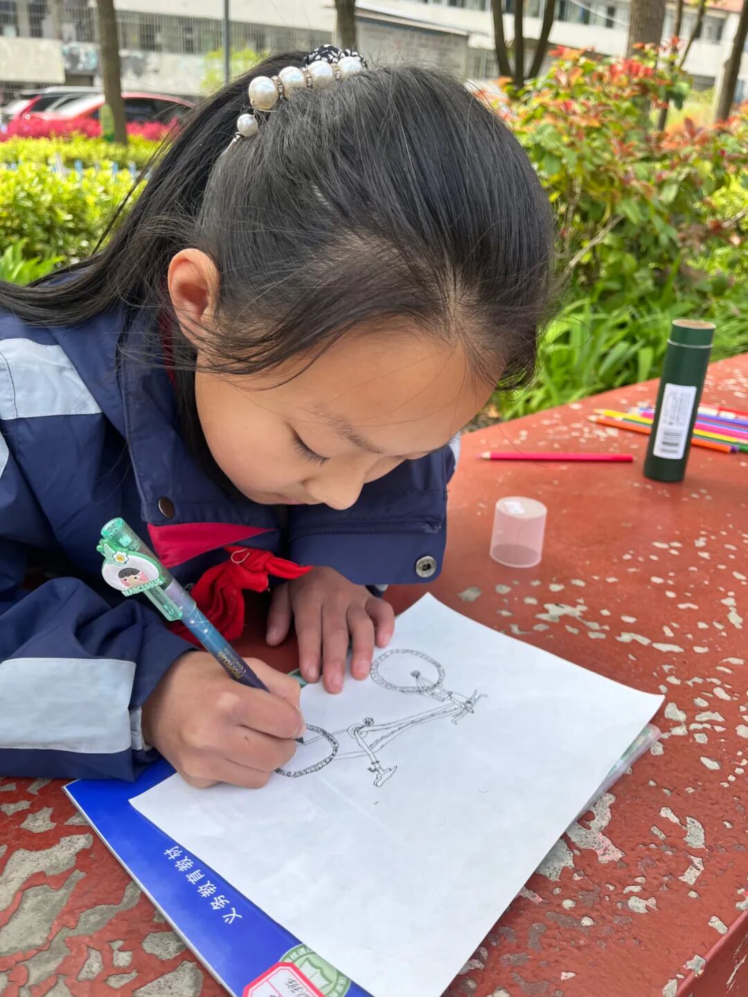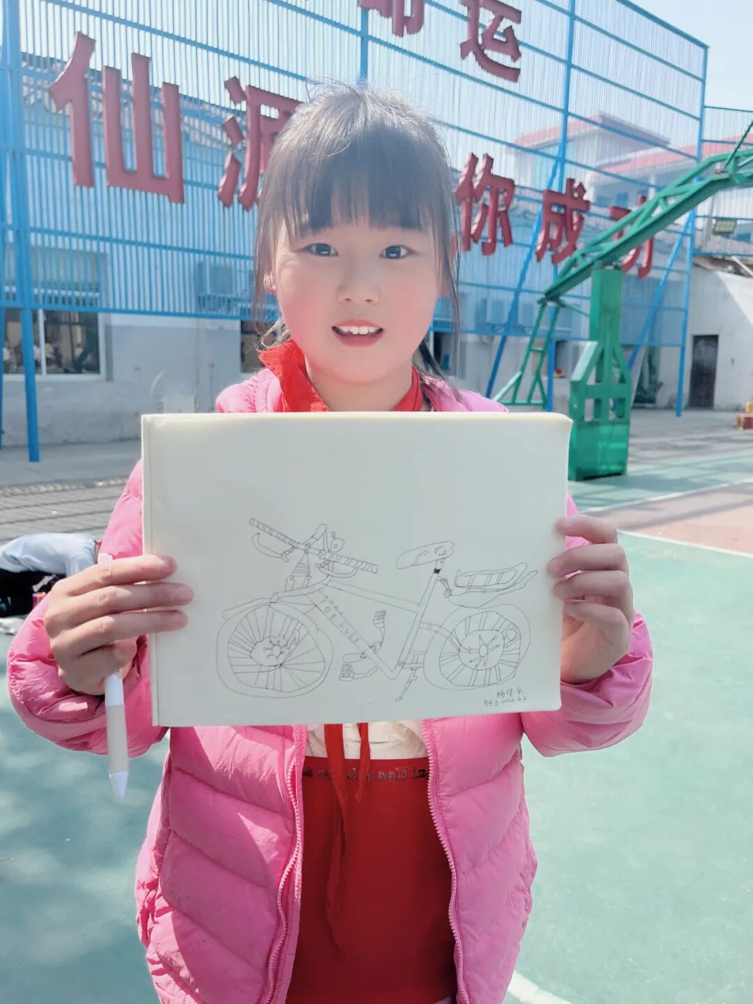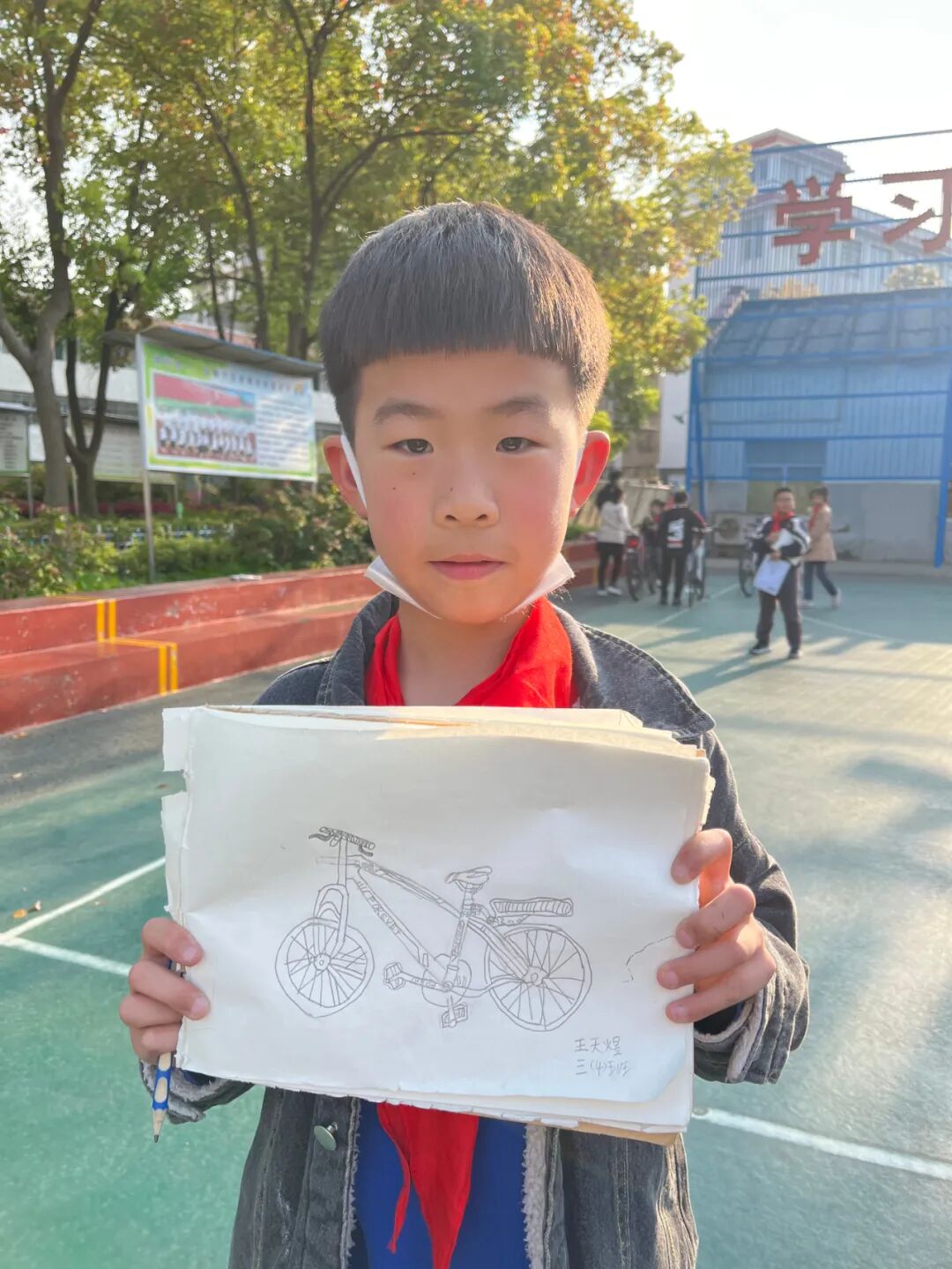通过对自行车的局部精细地观察,然后进行线条的表现,看!同学们的作品,在提高学生的观察能力的同时又提升了同学们线条的造型能力。 看我们多认真.... 认真的观察,细致的描绘。 通过这样的一节美术课让学生感受到创作的乐趣,充分调动了他们的艺术潜能。![]()