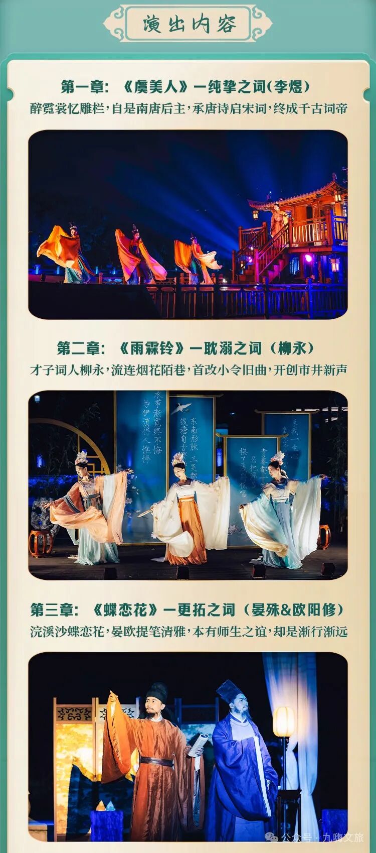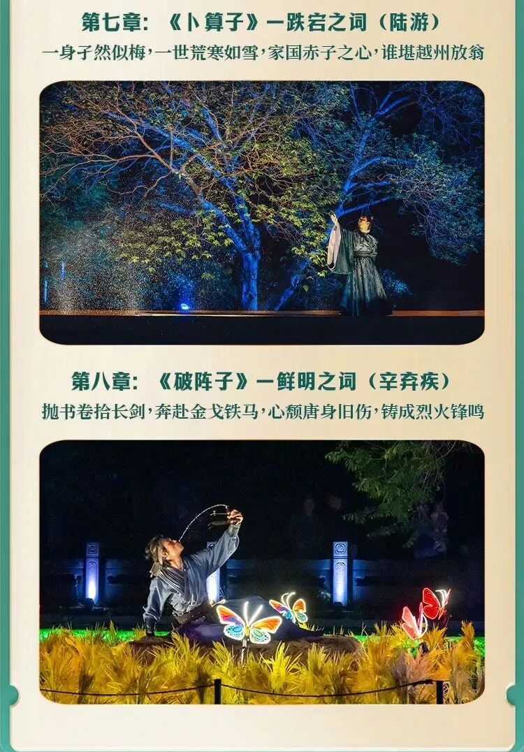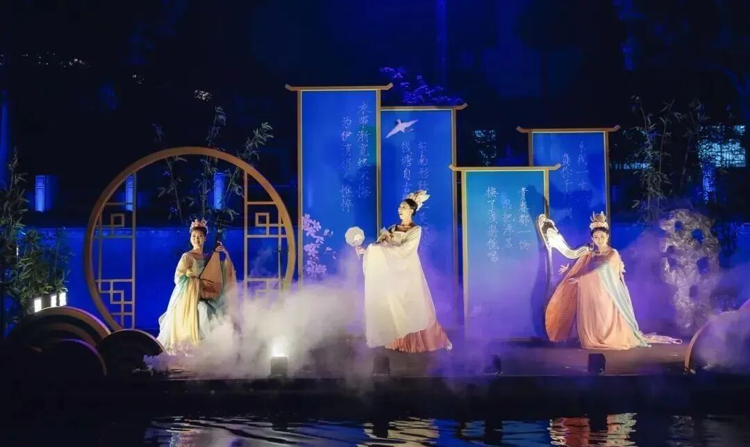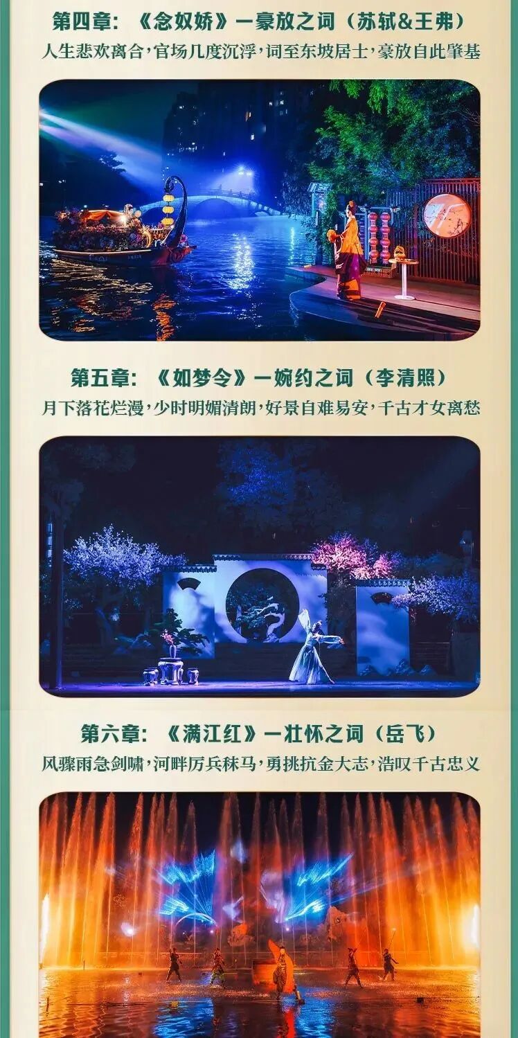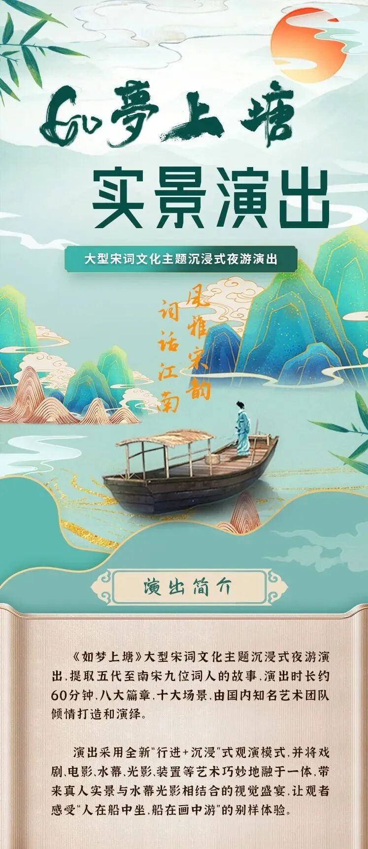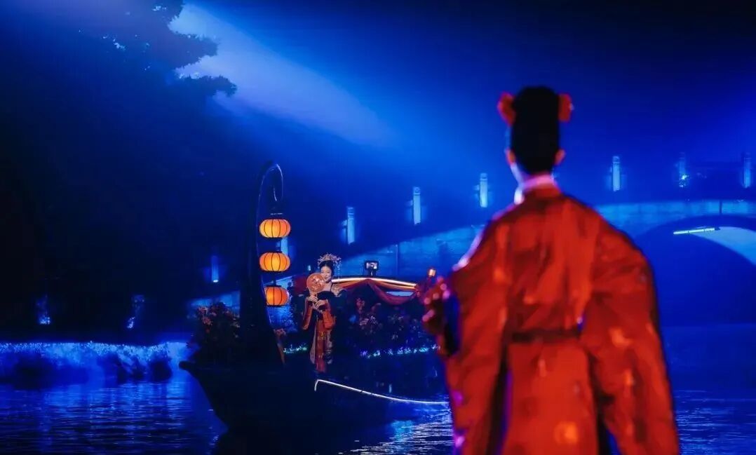 如梦上塘 杭州夜游必打卡 《如梦上塘》创作灵感源于杭州历史上第一条运河—上塘河。这条最早由秦始皇开凿的古河道作为京杭大运河的重要支流,既是大运河世界文化遗产不可分割的组成部分,也是杭州历史文化长廊和江南水乡风土人情的缩影,承载了无数的江南诗韵与历史典故。 相约如梦 《如梦上塘》自2021年10月正式开演以来,一直广受市民游客喜爱,更多次获得央媒、省媒的聚焦报道。今年5月份,迎来重要改版更新。演出以宋词为主题,提取五代至南宋九位词人的故事。演出时长约60分钟,八大篇章,十大场景,经典演绎宋韵风雅。演出采用全新“行进+沉浸”式观演模式,并将戏剧、电影、水幕、光影、装置等艺术巧妙地融于一体,带来真人实景与水幕光影相结合的视觉盛宴,让观者感受“人在船中坐,船在画中游”的别样体验。