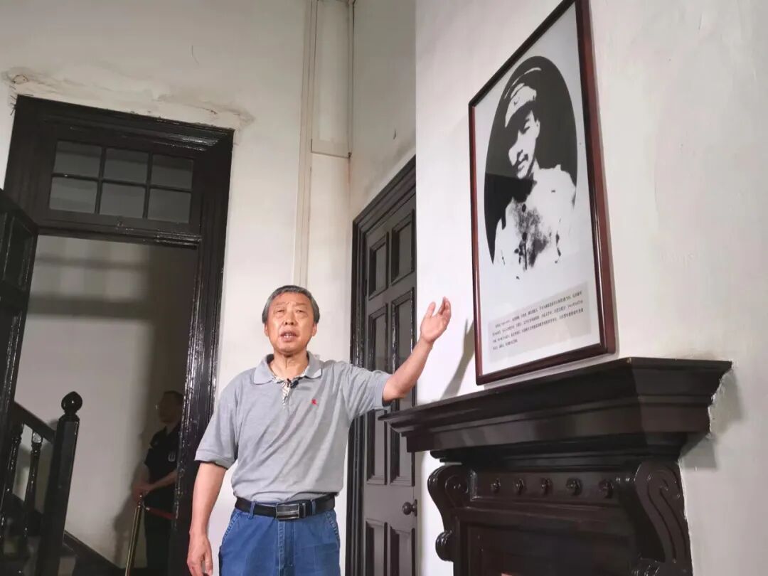 作者蔡礼鸿,为蔡济民之孙,图为蔡礼鸿在辛亥革命武昌起义纪念馆(红楼)一楼蔡济民像前。