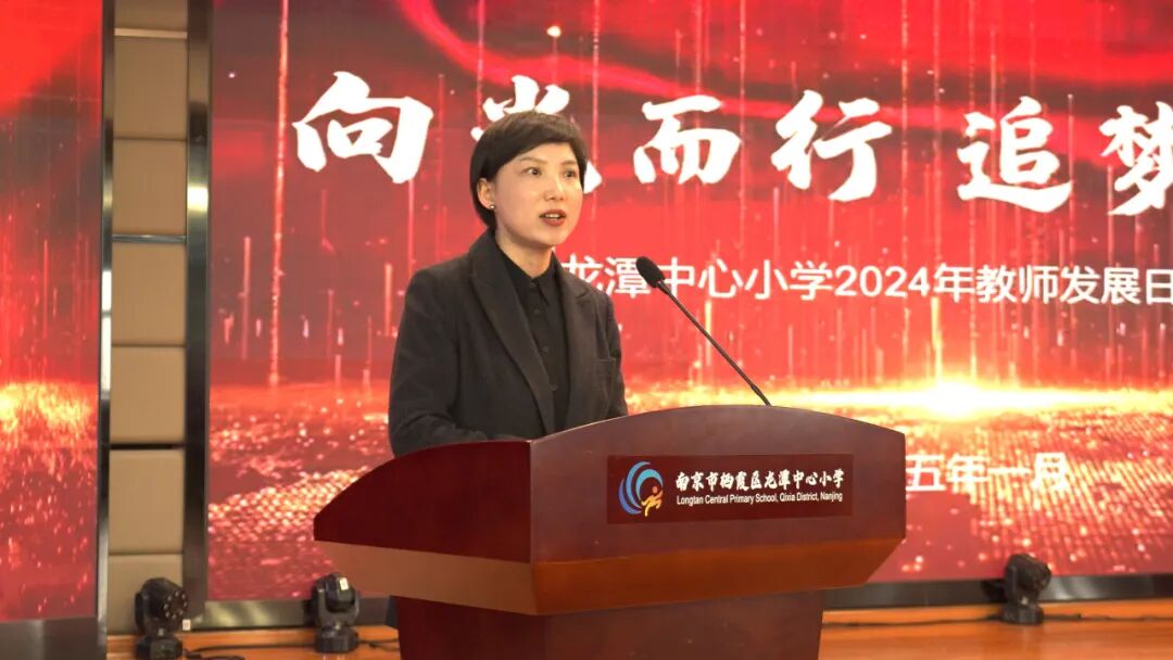 ─ 1月17日,南京市栖霞区龙潭中心小学教育集团在龙岸花园校区报告厅举行“向光而行,追梦持愿”2024年教师发展日活动。 龙潭街道二级调研员袁秀平 龙潭街道人大工委主任李斌 栖霞区教育局副局长陈婷婷 龙潭街道党政办主任曹安定 龙潭街道教育办主任高欣 龙小教育集团党总支书记陈志军 龙小教育集团校长吴兴林 龙小教育集团全体教职工 《魅力校园》制片部荣誉出品 集团书记致辞 龙小教育集团党总支书记陈志军首先致辞,他对过去一年集团取得的各项成绩表示肯定,希望2025年全体教师继续铆足干劲,追光前行。 本次活动共分为三个篇章。在第一篇章中,教师带来的舞蹈《一起向未来》,展现了龙小教育集团教师积极向上的精神风貌。靖安小学带来三句半《赞龙小》,用幽默诙谐的方式表达了对学校发展的赞美。龙潭街道办事处带来歌曲《绒花》,歌声悠扬婉转。龙小音乐组的民乐合奏《兰亭序》,江畔人家校区的情景剧《师生喜乐汇》等节目精彩纷呈,充分展示了龙小教育集团教师的多才多艺。 舞蹈《一起向未来》 三句半《赞龙小》 歌曲《绒花》 民乐合奏《兰亭序》 情景剧《师生喜乐汇》 第二篇章中,龙小教育集团行政代表带来迎新年歌曲串烧,温暖的歌声传递着新年的美好祝福。美术组的《鎏光溢彩show》,为传统艺术注入青春活力。特别设立的竞答环节《追光教育路》,以四校区为单位展开激烈角逐,不仅增进了教师之间的交流,也提升了大家对教育理念的理解。长江小学教师团队带来的表演唱《小美满》,唱出了教育事业带来的美好与幸福。 第三篇章中,访谈节目《爱在龙小 向光而行》,通过与老、中、青三代教师代表对话,分享他们在学校的教育故事,展现了龙小教育精神的传承。龙潭中心小学本部带来的歌舞《阳光路上》,寓意着龙小教育人在教育之路上勇往直前。活动最后,全体人员齐诵《百年龙小铭》,唱响《龙小吟》,铿锵的词句、激昂的旋律将现场气氛推向高潮。 访谈节目《爱在龙小 向光而行》 歌舞《阳光路上》 齐诵《百年龙小铭》,唱响《龙小吟》 活动最后,龙潭街道二级调研员袁秀平发表讲话,他对龙小教育集团的发展给予高度评价,并表示街道将一如既往地支持龙小集团教育事业。 编辑:朱珺 编导:朱珺 摄像:王景朗坤 ▼ — 专注南京教育22年 — 长按或扫描二维码 关注 南京魅力校园 运营:李雯 丁蓉 罗媛媛 徐佳佳 审核:马群 刘云 统筹:朱珺 陈珍 监制:沈峰 ? 南京魅力校园 本平台的图文视频均为《魅力校园》栏目组自主拍摄和制作。未经授权,不得转载,转载需注明出处。平台所使用的其他图片及音乐如属于相关权利人所有,请相关权利人随时与我们联系以协商授权或删除事宜。 点击蓝字 关注南京魅力校园 ─