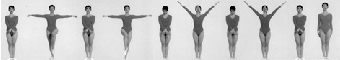 1 跳起,左、右分腿落地,同时两臂胸前平屈,两手半握拳(拳心向下)。2 跳起,还原成直立。3 跳起,左、右分腿落地,同时两臂经侧至头上击掌。4 跳起,还原成直立。5~8 同1~4,第四个八拍的最后一拍,两臂成体前交叉,两手半握拳(掌心向后)。