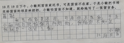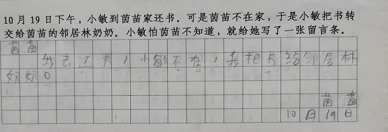 (1)“于是小敏把书转交给茵苗的邻居林奶奶”这句话在留言条中的表述应该是“我把书寄放在你的邻居林奶奶那里了”。出现这样的错误,说明孩子对这个情景不理解。谁是谁的谁,分不清。