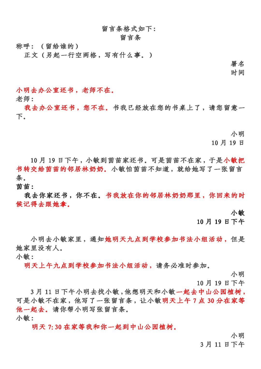 留言条题目2、正文内容要注意表达方式的转变。