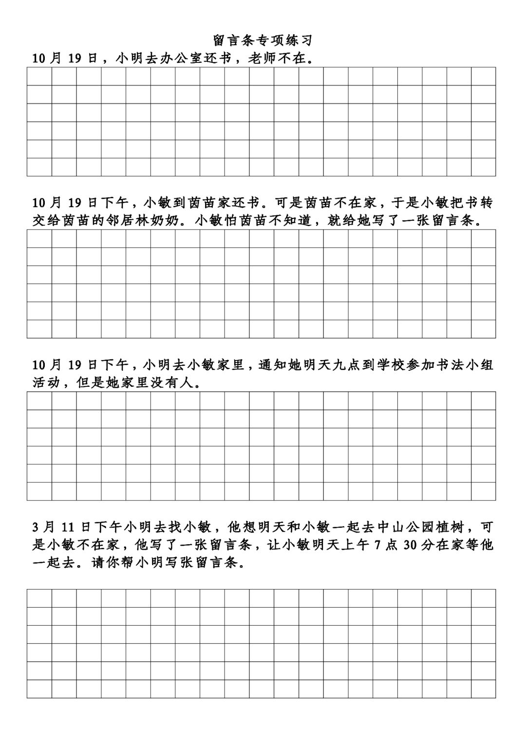 (4)小明去找小敏,他想明天和小敏一起去中山公园植树,可是小敏不在家,他写了一张留言条,让小敏明天上午7点30分在家等他一起去。请你帮小明写张留言条。