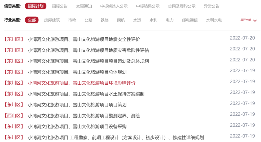 云南省公共资源交易平台近日发布了一系列关于东川区小清河文化旅游项目、雪山文化旅游项目的招标计划,预计招标公告发布时间8月份,总投资多达30亿元。