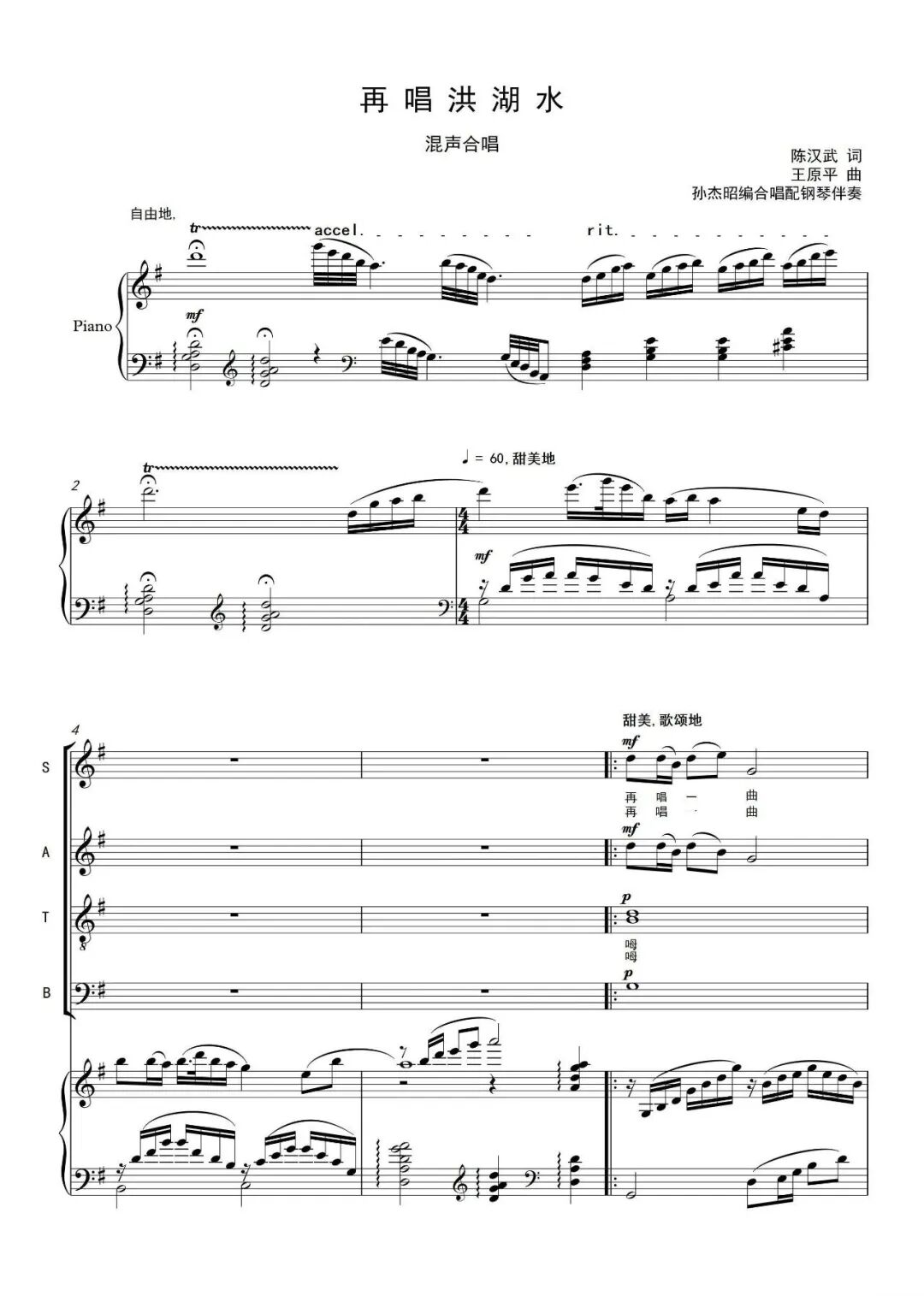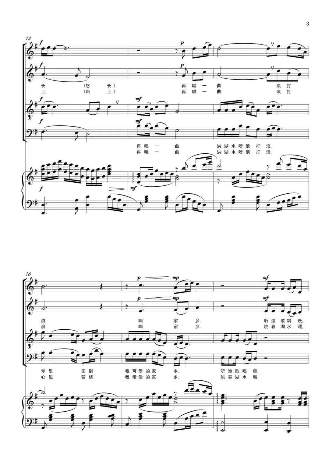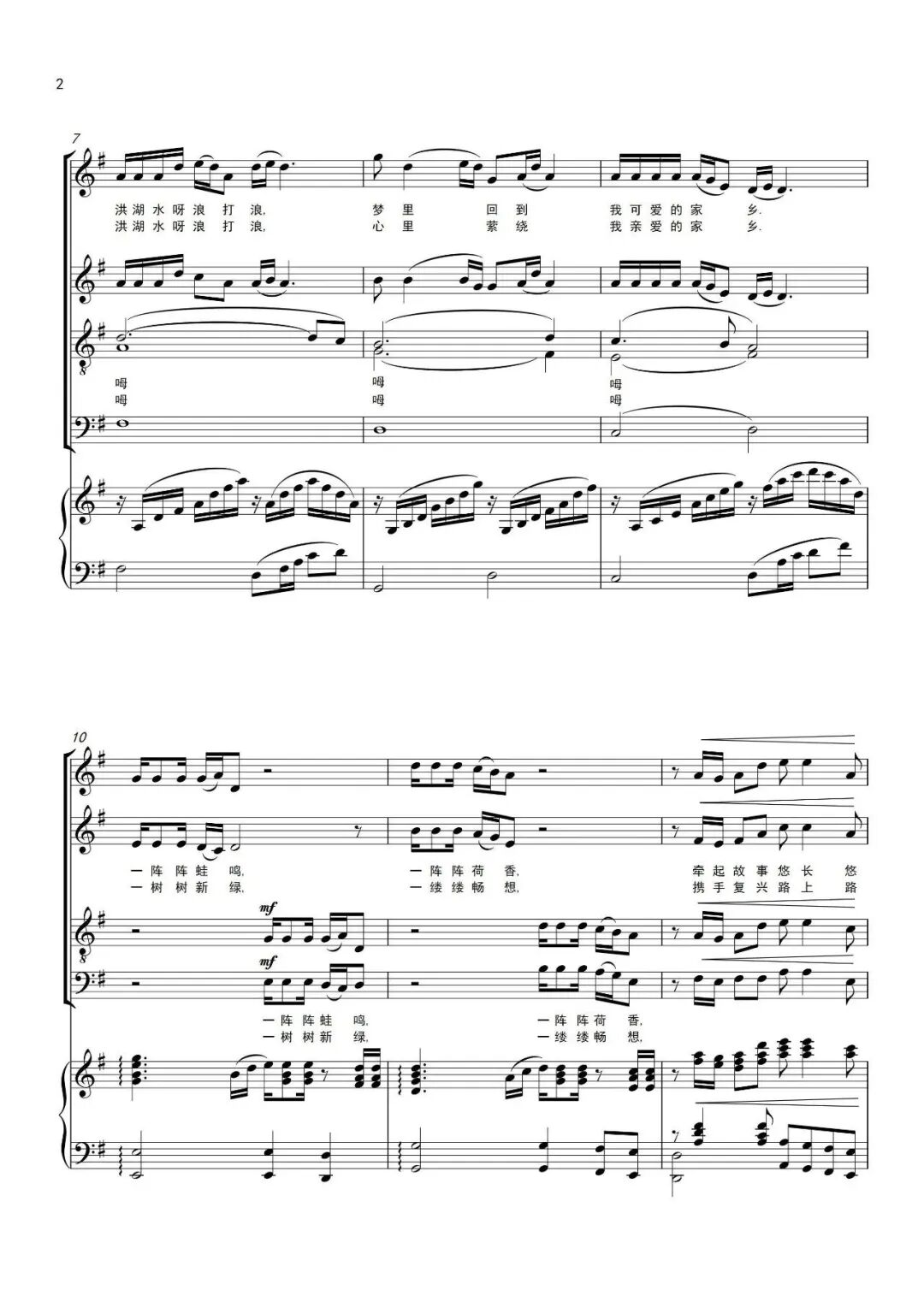 《再唱洪湖水》是由著名词作家陈汉武填词,曲作家王原平谱曲的一首歌曲。该歌曲创作于2012年,沿用了经典歌剧《洪湖水浪打浪》的江汉平原音乐风格,借助洪湖的历史影响,抒发了人们对绿色洪湖的热爱与眷恋,并唱出了洪湖人奋发图强、携手走向复兴的美好愿景。歌曲旋律亲切,画面感强,歌词唯美,展现了洪湖的特点和新时代洪湖人的风貌。此歌不仅是继《洪湖水浪打浪》之后的又一代表洪湖形象的靓丽名片,更是一部充满时代特点和乡土情节的佳作。 左右滑动查看完整曲谱 END 曲谱|网络 免责声明 “音乐大师学院”中文官方微信公众平台的部分内容来源于网络,旨在传递更多音乐艺术相关信息,仅供音乐爱好者学习、交流、研究使用,版权归原作者所有。如引用内容涉及版权等问题,请及时联系我们,以便我们予以改正。 音乐大师学院是一个涉及合唱、声乐、键盘(钢琴、手风琴)、弦乐、管乐、打击乐、音乐舞蹈等领域的专业教学、研讨、展示的在线音乐教育平台。 致力于整合世界范围内的音乐教育专家,向一线音乐教育工作者、广大青少年音乐爱好者传授音乐教育先进理念、体系、方法,助力一线音乐教育工作者在专业水平方面的进一步提升,为热爱音乐的青少年提供珍贵的学习机会,为音乐艺术团体提供专业的展示平台。 音乐大师学院|音乐道路上的领路人! 国际音乐大师入驻,海量课程资源助力快速提升! ■■■ 音乐大师学院 手机号|138-1178-4824 长按扫描二维码 开启音乐大师学院的线上学习之旅 点击名片 关注我们 情感启示在合唱指挥中的功能与运用 合唱指挥处理音乐作品的手法 曲谱分享|二声部合唱《莫尼山》 小学音乐体验式合唱教学中的问题与对策 合唱教学:追求“和”的效应 视唱练耳在少儿合唱训练中的应用 曲谱分享|男声四重唱《故乡的云》 合唱训练中的音准把握策略 童声合唱的训练要点 曲谱分享|二声部合唱《奉献》 起拍和收拍技巧在合唱指挥中的应用 “肢体辅助式”发声练习 在合唱训练中的作用 合唱艺术中的音色融合与表现力研究 合唱指挥技巧对音乐表现的影响 曲谱分享|童声合唱《大山的小姑娘》(本曲适合童声、女声合唱团) 合唱教学中的基础训练方法 曲谱分享|混声合唱《春风十万里》 情感表达在合唱课教学中的应用 合唱指挥手势动作设计与作品情感的对应 曲谱分享|童声合唱《牧童之歌》![]()