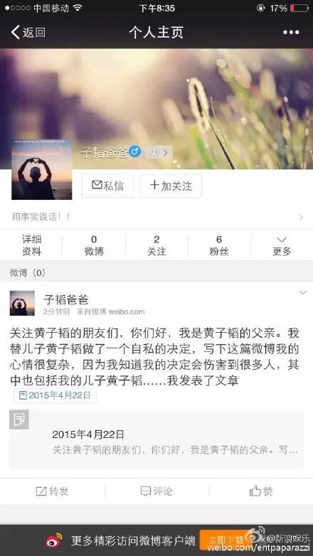 也有可能是我国水土太养人了,涛涛不想再回万恶的韩国了。4月22日,黄子韬爸爸在微博发表声明,意思是,涛涛也准备跟SM公司解约了!听名字就不是啥好公司,哼!