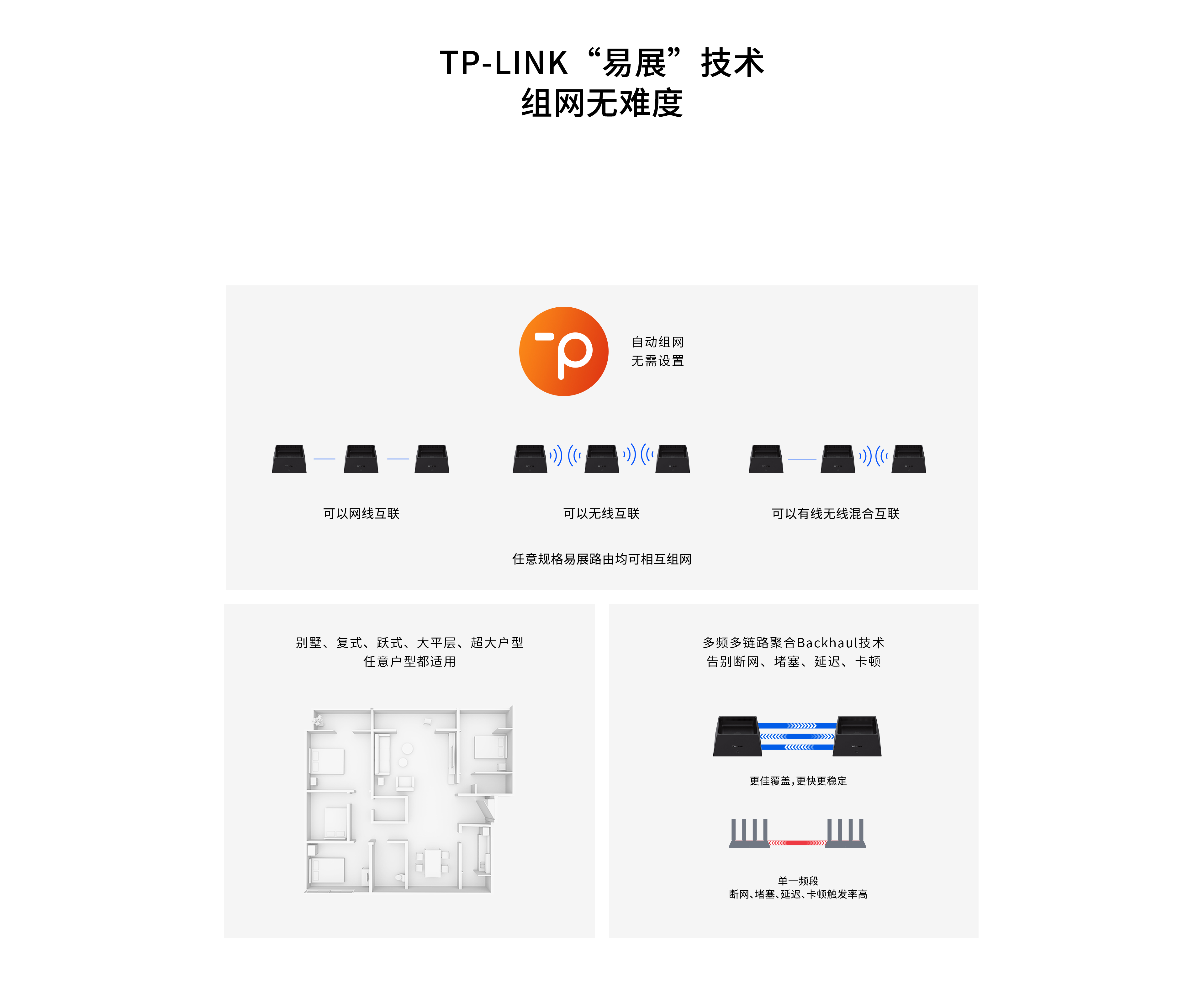 TP-LINK自主研发的“易展”MESH技术,凭借多频多链路聚合Backhaul、任意规格“易
