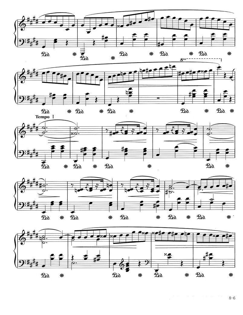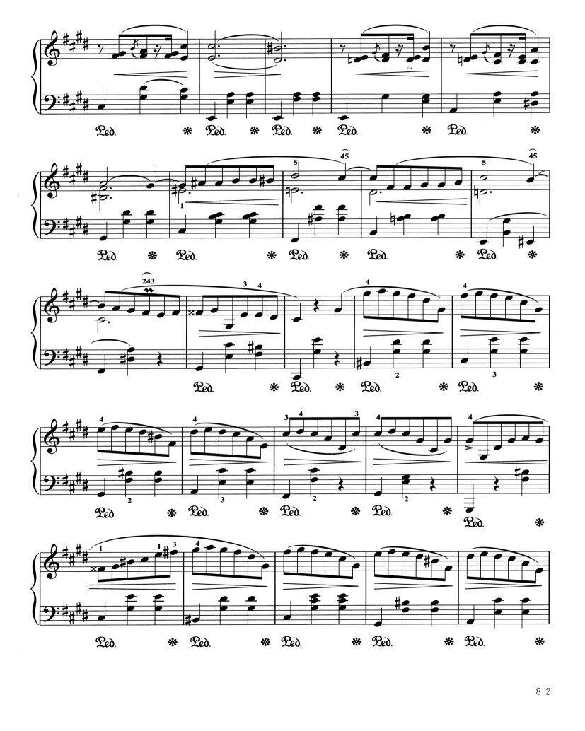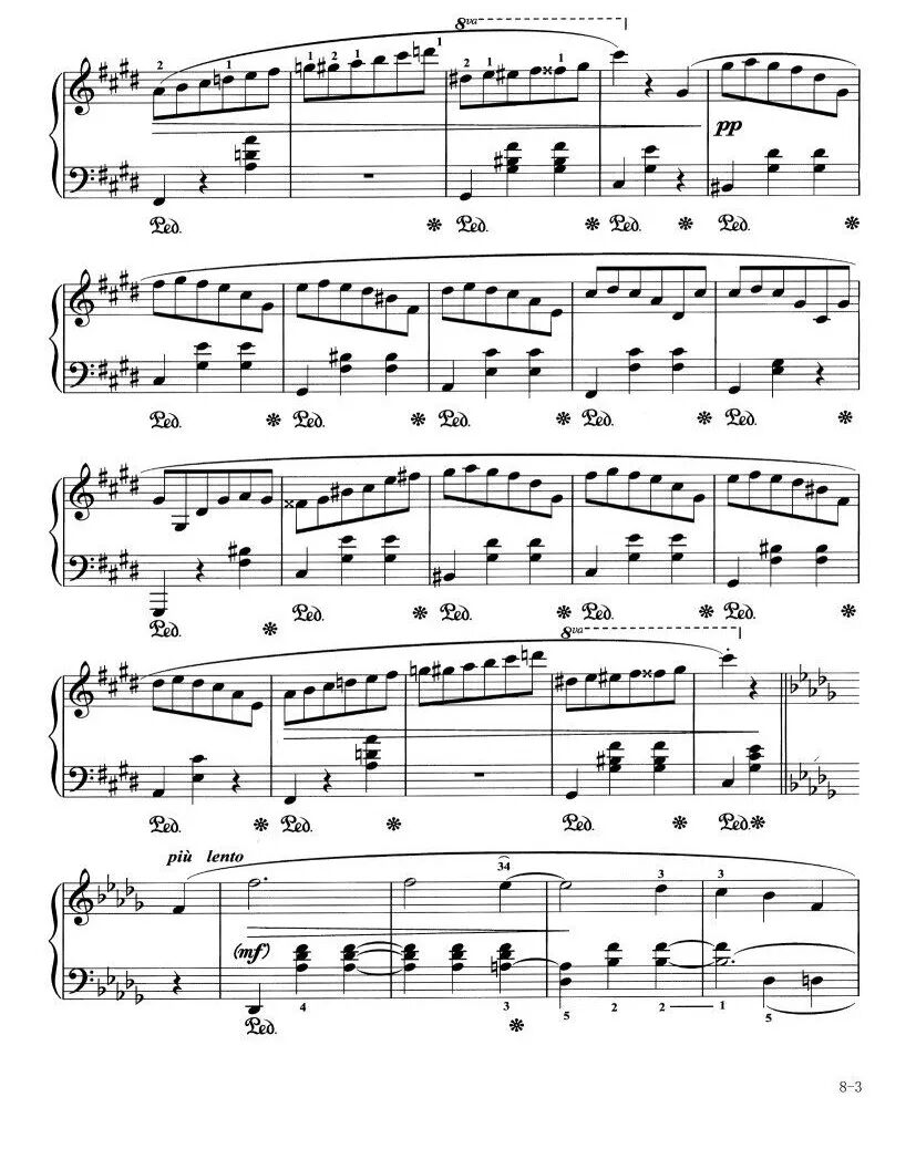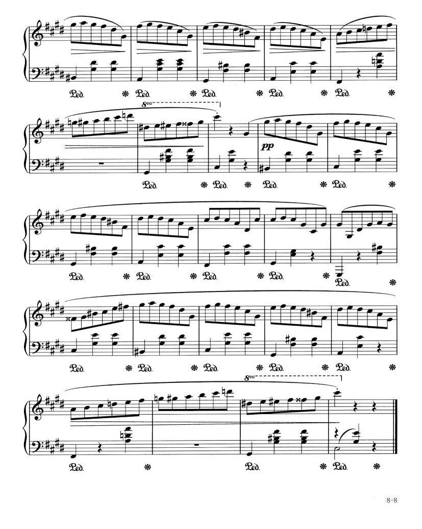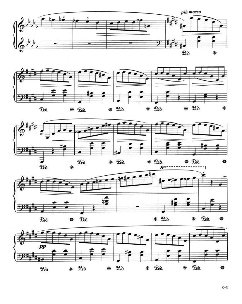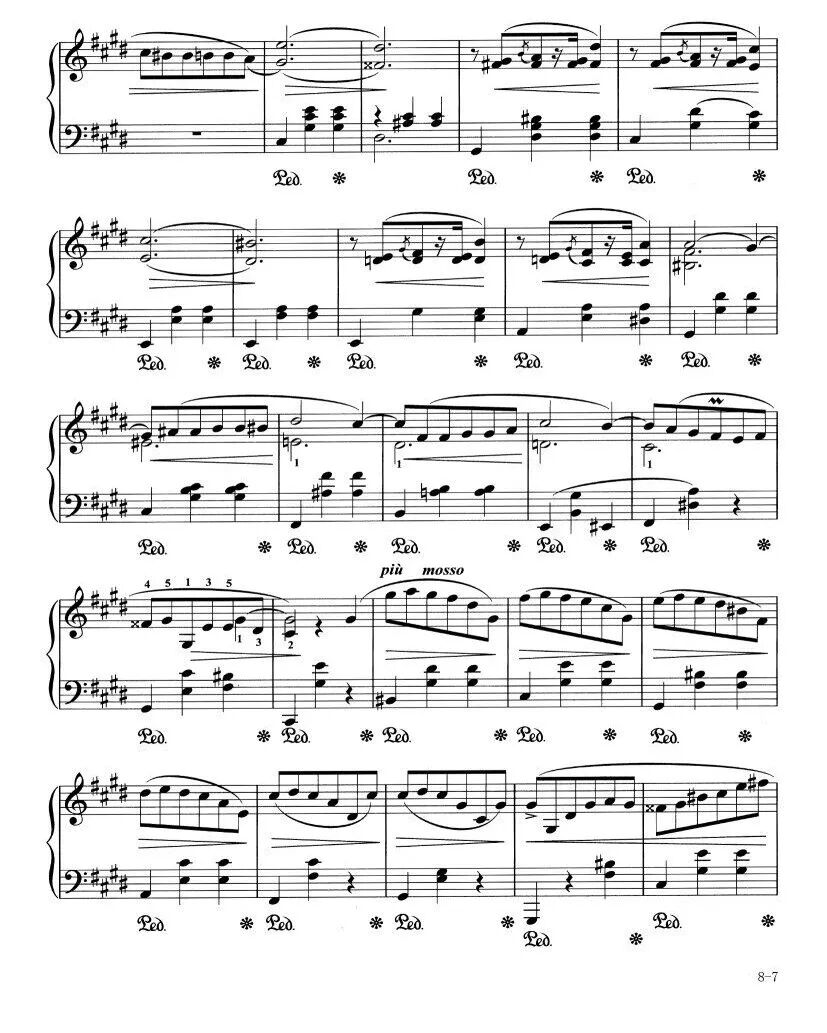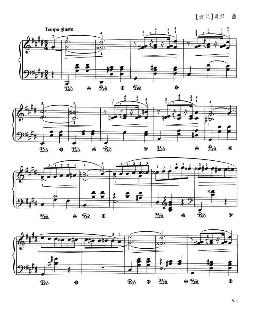 这是肖邦在去世前两年创作的,具有浓郁的民族性,其节奏近似波兰的玛祖卡舞曲,是一首典型的圆舞曲抒情诗。最能体现肖邦的个性及民族性的圆舞曲,任何人都肯定会说是这首《升c小调圆舞曲》。本曲作于1846—1847年,节奏近似马祖卡舞曲,但完全不是为舞蹈伴奏的舞曲,而是真正的圆舞曲抒情诗。本曲是肖邦去世前两年完成的,隐含着他对生命的认识。舒曼曾把肖邦的圆舞曲称为“心灵的圆舞曲”,该说法对于本曲而言是再确切不过了。乐曲为三段体式,无序奏。一开始便是流露着一丝忧伤的第一段主旋律,仍然具有肖邦那轻柔、飘逸的性格特征,可见作者对美好生活仍有一线憧憬。第二段为急速的连动,似滚珠落玉般晶莹剔透。但这不是肖邦以往作品中那种华丽的风格,而是充满着一种无奈的旋律,仿佛是作者在倾诉他孤寂的晚年生活。当时,久居异乡、孑然一身的肖邦身染重病、无依无靠,其心情之忧郁可想而知。中段转为降D大调,多少明朗了些,但是很快又出现郁闷的气氛。在回旋连动过后,反复开头的主旋律,最后全曲在焦躁不安中终了。