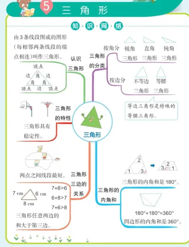 1、由三条线段围成的图形(每相邻两条线段的端点相连)叫做三角形。 2、从三角形的一个顶点到它的对边做一条垂线,顶点到垂足之间的线段叫做三角形的高,这条边叫做三角形的底。三角形只有3条高。 3、三角形具有稳定性。 4、三角形任意两边之和大于第三边。 5、三个角都是锐角的三角形叫做锐角三角形。 6、有一个角是直角的三角形叫做直角三角形。 7、有一个角是钝角的三角形叫做钝角三角形。 8、每个三角形都至少有两个锐角;每个三角形至多有1个直角;每个三角形至多有1个钝角。 9、两条边相等的三角形叫做等腰三角形。 10、三条边都相等的三角形叫等边三角形,也叫正三角形。 11、等边三角形是特殊的等腰三角形 12、三角形的内角和是180°。 13、四边形的内角和是360° 14、用2个相同的三角形可以拼成一个平行四边形。 15、用2个相同的直角三角形可以拼成一个平行四边形、一个长方形、一个大三角形。 16、用2个相同的等腰的直角的三角形可以拼成一个平行四边形、一个正方形。一个大的等腰的直角的三角形。 | |