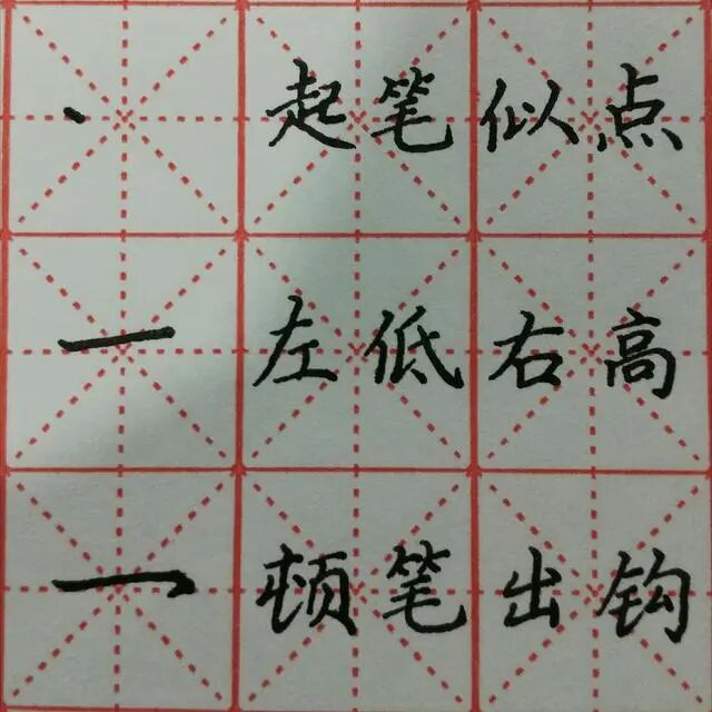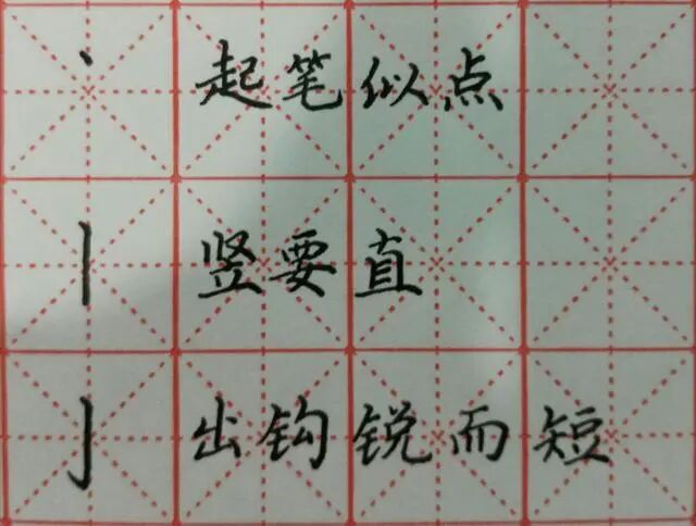 今天我们学习基本笔画钩。钩分为横钩、竖钩、弯钩、竖弯钩等。常见的是横钩和竖钩。 钩画不是一种独立笔画,它是依附在其它笔画末端的笔画。依附横,组合成横钩,依附竖,组合成竖钩。 横钩的起笔与长横相同,笔尖沿45度线落笔,稍停后顺势向右行笔,至出钩处,向右下方顿笔出钩,末端出尖。出钩角度约45度。 横钩的分解和注意事项。 竖钩的写法: