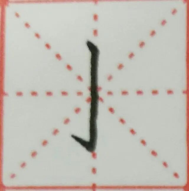 竖钩的起笔与竖画相同,笔尖沿45度线落笔,稍停后向下行笔,行笔至出钩处向左下方稍顿笔,然后迅速钩出,钩出角度约45度。钩出尖的部分要有力感,稍短,不要过长。