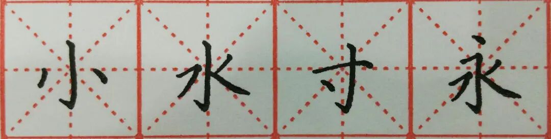 竖钩常见字“小”“水”“寸”“永”等,练习时注意每个笔画的安放位置!