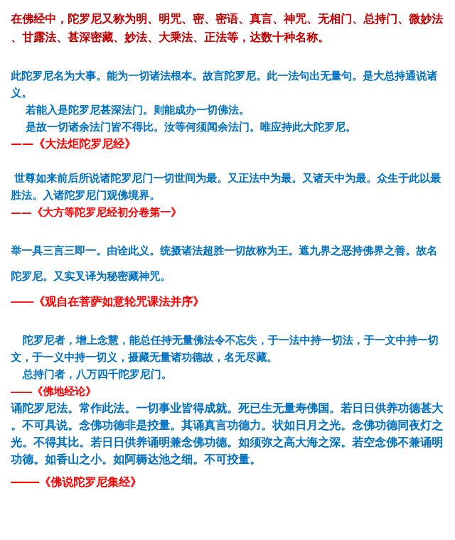 佛曾经说过陀罗尼的殊胜之处,《大乘理趣六波罗蜜多经》中说:“若彼有情,不能受持,契经,调伏,对法,般若。或复有情造诸恶业——四重、八重、五无间罪、谤方等经、一阐提等种种重罪——使得销灭速疾解脱顿悟涅槃,而为彼说诸陀罗尼藏。”佛也让众生多念诵陀罗尼咒,陀罗尼对于转换心念是非常有效的,如果没有持诵陀罗尼咒语只念圣号的话还是有很多师兄修行不得力,如果想要修行得力的话就要念各种陀罗尼,有针对性的念诵,加持我们在修行路上走下去,走得稳走得好,乃至往生成佛。