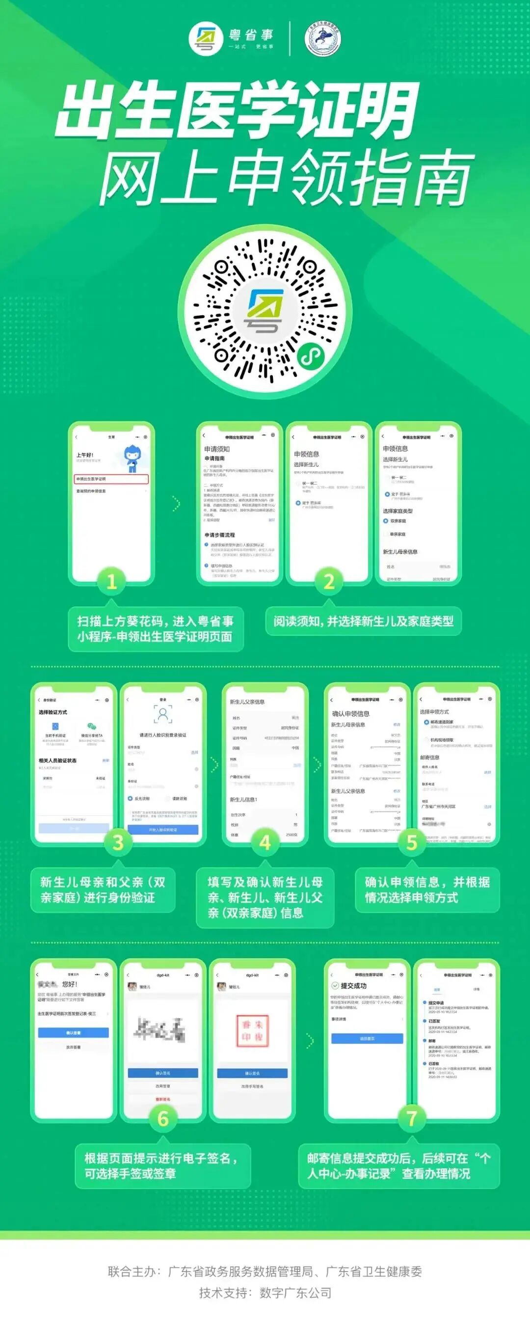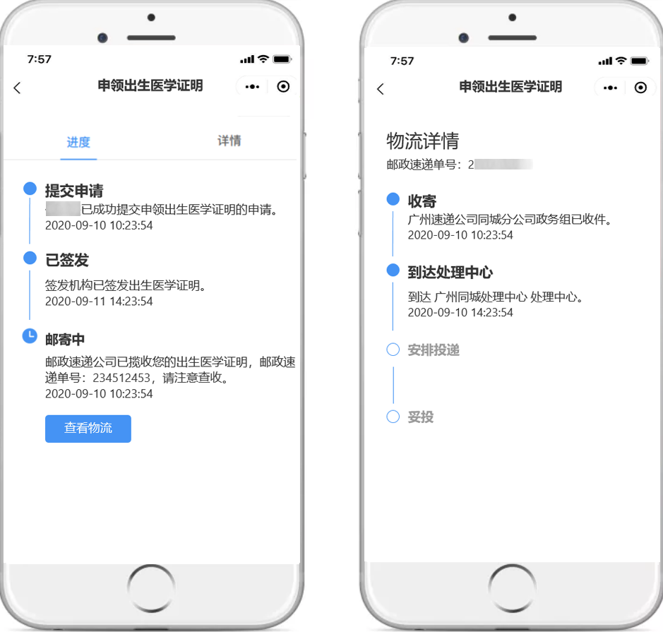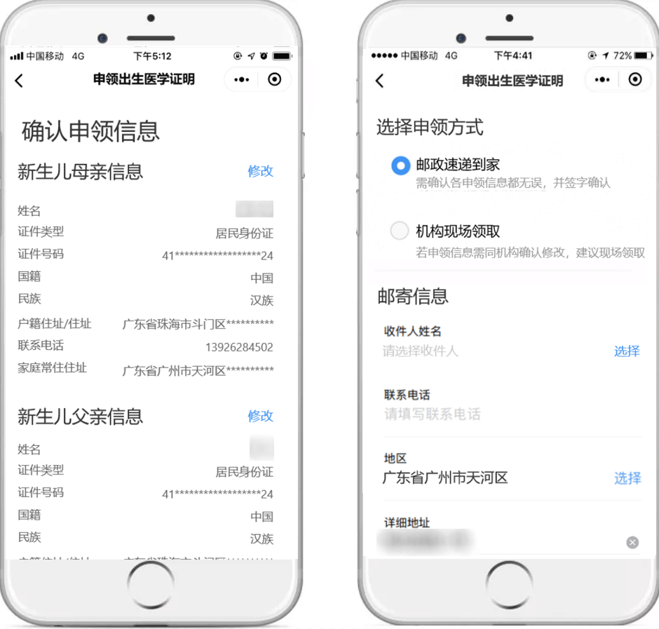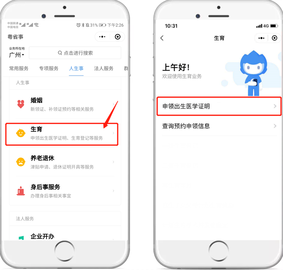 网上如何申领?请认准以下操作指南 (1)微信小程序搜索进入:微信搜索“粤省事”小程序,进入小程序首页左上角切换所在城市,点击右上角放大镜图标搜索“出生证”等关键词。 (2)微信搜索登录“粤省事”小程序,首页下滑点击“生育”板块,选择“申领出生医学证明”。 【温馨提示】 必须由母亲通过“粤省事”微信小程序发起办理申请。 操作流程 按页面要求填写信息,点击“下一步”。 提交成功后,即可等待签发机构处理。 查询进度和详情 办理完成后,可在“个人中心-办事记录”查看办理进度和邮寄情况。 选择邮政速递到家的,当办理进度为“邮寄中”时,可在“个人中心-办事记录”中查看邮寄物流详情。 选择预约机构领取的,也可从“生育”服务页面进入查询预约申领信息,领证时需新生儿母亲或父亲凭本人身份证和手机,现场刷脸认证、签名领取。 答疑解惑 1、快递费用谁来承担 邮政速递费用由申领人承担,因邮政速递过程产生的相关费用由申领人与邮政速递部门进行结算,速递资费按照邮政速递部门有关规定执行。 出生医学证明签发机构不收取任何费用。邮政速递过程中,若由于邮政速递原因导致出生医学证明邮件发生丢失、损坏、损毁等意外情况,邮政速递部门将主动与申领人联系,做好解释说明和补办工作,并向有关签发机构出具丢失证明文件及整改措施,协商进行补办,重新由邮政速递送达。 2、新生儿父亲可以网上办理申领业务吗? 新生儿出生医学证明线上申领只能由新生儿母亲办理。 3、哪些情况无法人脸识别认证网上申请申领? ①外籍人士; ②台湾同胞; ③夫妻双方均为港澳同胞或华侨; ④其他特殊无法刷脸认证的情形(可咨询分娩机构); ⑤换发和补发出生证暂不能网上申领。 无法通过“粤省事”微信小程序刷脸认证的,不能进行网上办理,请按助产机构原签发流程和需提供的材料现场办理。 4、申请成功后能否取消或变更? 当前申请成功后,可变更或取消(包括预约过期)3次,之后仍未办理的,只能按原签发流程和需提交的材料办理签发。 5、出生医学证明已签发,新生儿姓名还能修改吗? 新生儿姓名一经签发原则不允许变更,欲变更新生儿姓名的,可在户籍部门办理出生登记后再依照相关规定申请姓名变更。 “粤省事”线上申领出生医学证明 各位新晋爸爸妈妈们 你学会了吗? 出生医学证明出新规!签发、换证、补发要注意→ 点击上方蓝字 了解现场办理出生证, 团结 创新 严谨 求实![]()