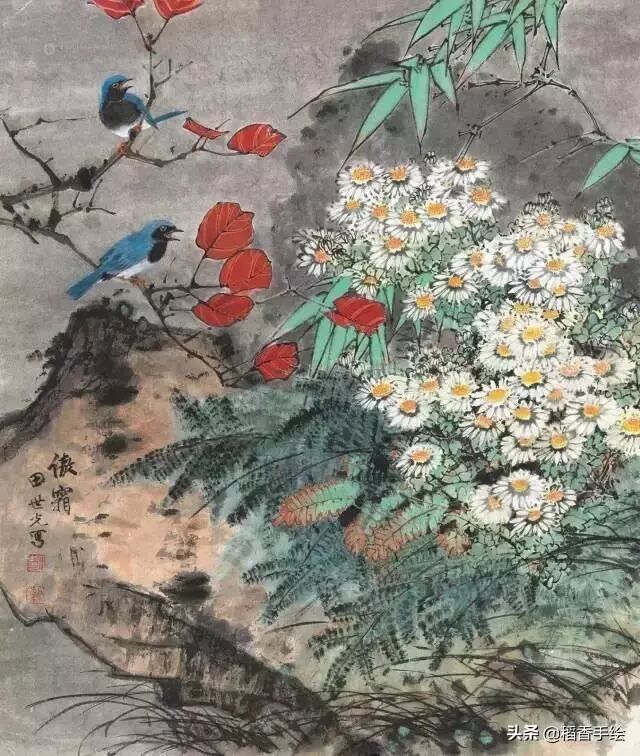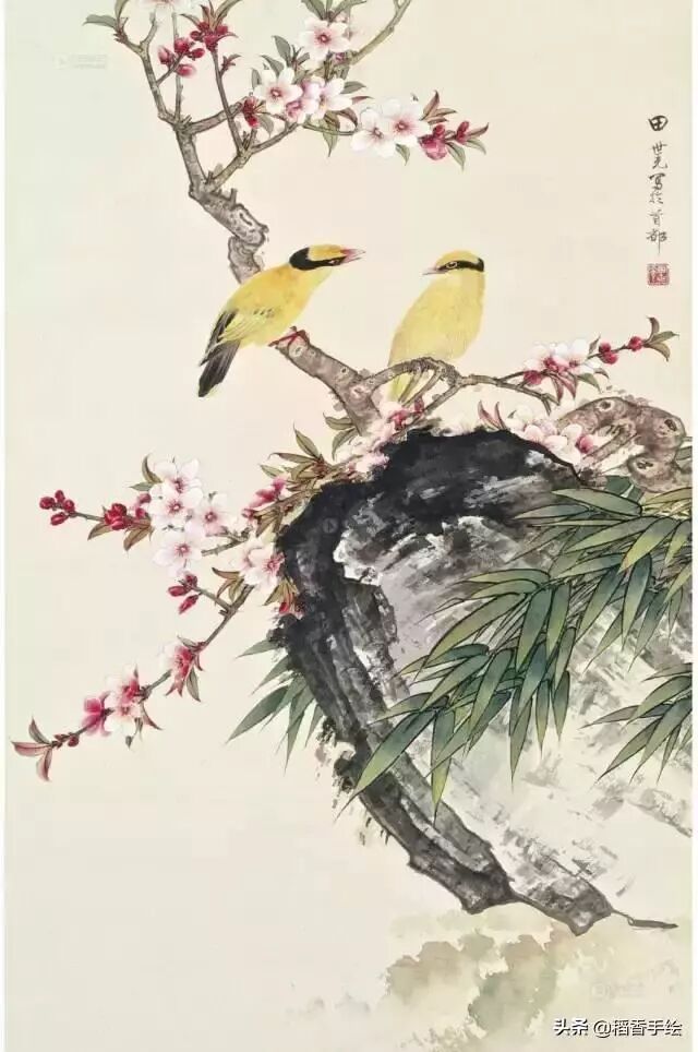 花卉包含树石,画树石必用皴法,用枯笔带湿随意扫去,逢节处,转弯处各不相同,各树种生长理、势不同,则皴法亦有别,桐横抹,柳斜擦,柔条细梗点到为止,不用双钩,盘根错节则不怕臃肿。花间画石头,宜整忌碎,刻意堆砌为一病。