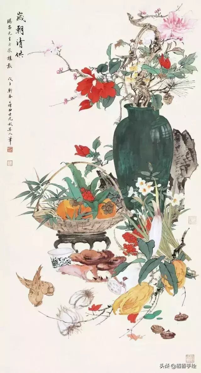 章法是针对一幅画之总势而言的。一幅作品,无论篇幅如何,所画内容必须分清主次,有虚有实,有疏有密、有阴阳向背。构图不宜顶天立地,太满或散碎,给人繁闷窒息之感,不符合大众审美习惯。按照一般的构图程式,画花卉宜左一右二,或上奇下偶,给人自然、稳重之感,布置得法,则密的地方不嫌满,疏的地方不嫌稀。画之总势得当,那么一花一叶也必得章法。花朵之圆缺是相对的,有时也是观赏角度不同导致的,大自然中必然不会有十分正圆的花朵,密叶中也必然会穿插着一些花枝,否则花、叶无从生发,绘画时观察须心细如发,无风时翻叶不必画太多,向日背花宜画在后面,转枝要画得干脆利落,不能弯弯曲曲蛇形状。