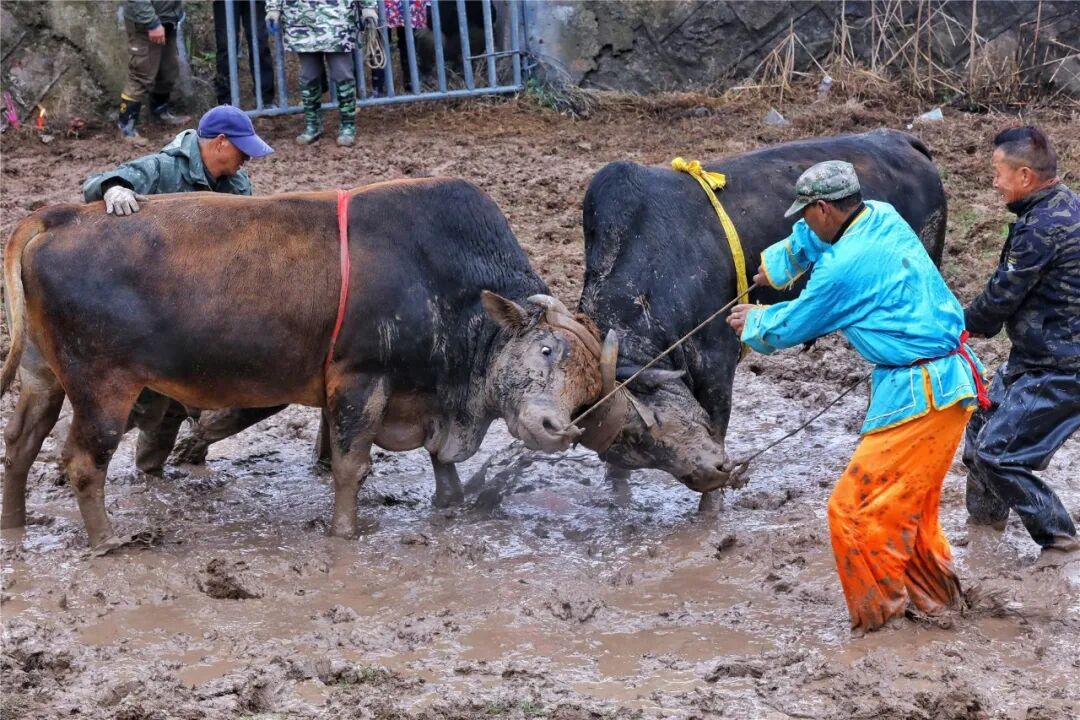 入场角斗前,每头斗牛都会吃下主人为之准备的8至10个生鸡蛋和1斤黄酒。据说,这是为牛助兴,让牛更加威猛善战。斗牛喝下烈酒后,就开始“哞哞”叫唤,让旁人不敢近前。第一组入场的两头牛还会被主人精心装扮,在牛角上捆上长长的两对须,配上一对大牛眼,说不上是喜感还是狰狞。