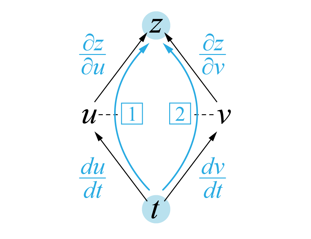 Th.1: 设 , , 。其中 在 处可导, 在对应点( 处有连续偏导数, 则复合函数 在 处可导,且