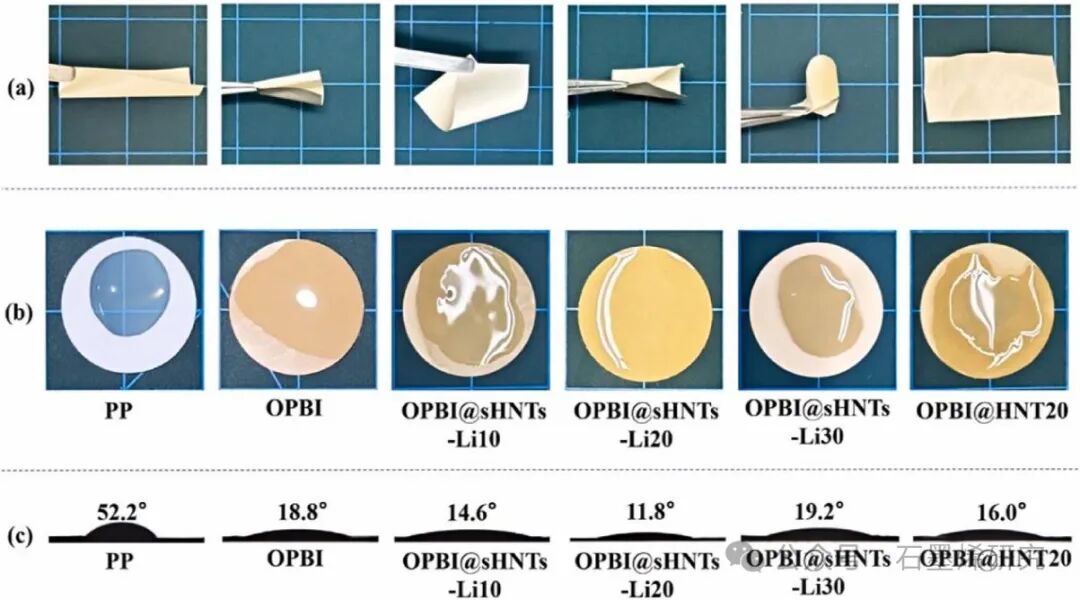 图 4. (a)OPBI@sHNT-Li20复合隔膜的折叠、弯曲、扭曲和恢复图像;(b)电解质润湿图像和(c)隔膜的接触角图像。