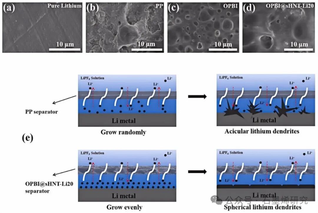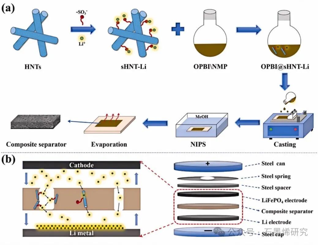 图 1. (a)OPBI@sHNT-Li复合隔膜的制备过程(b)OPBI@sHNT-Li复合隔膜在电池内部的作用机理。