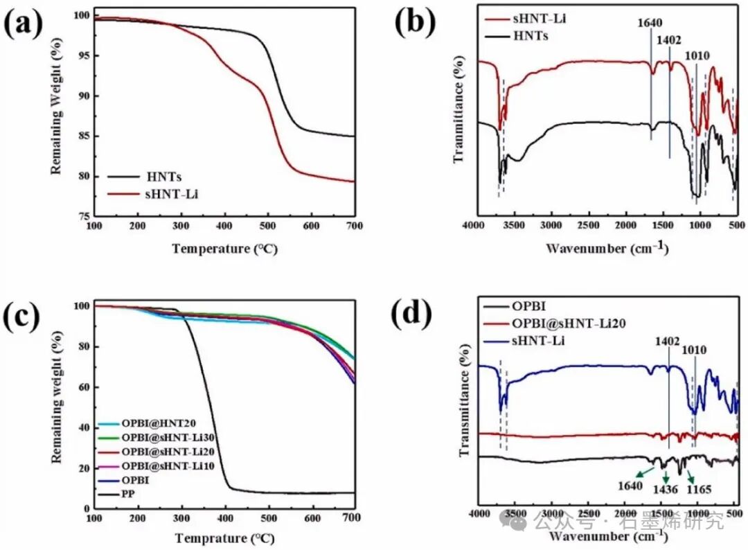 图 2. (a)HNTs、sHNT-Li的TGA曲线和(b)FT-IR光谱;(c)隔膜的TGA曲线;(d)OPBI、OPBI@sHNT-Li20隔膜和sHNT-Li的FT-IR光谱。