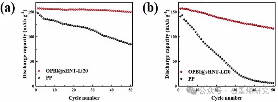 图 9. 用 PP 和 OPBI@sHNT-Li 隔膜组装的电池在(a)50 °C、0.5 C 和(b)90 °C、0.5 C 下的循环稳定性。