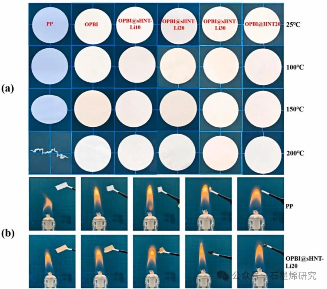 图 5. (a)隔膜在不同温度下放置1小时后的图像;(b)隔膜燃烧实验。