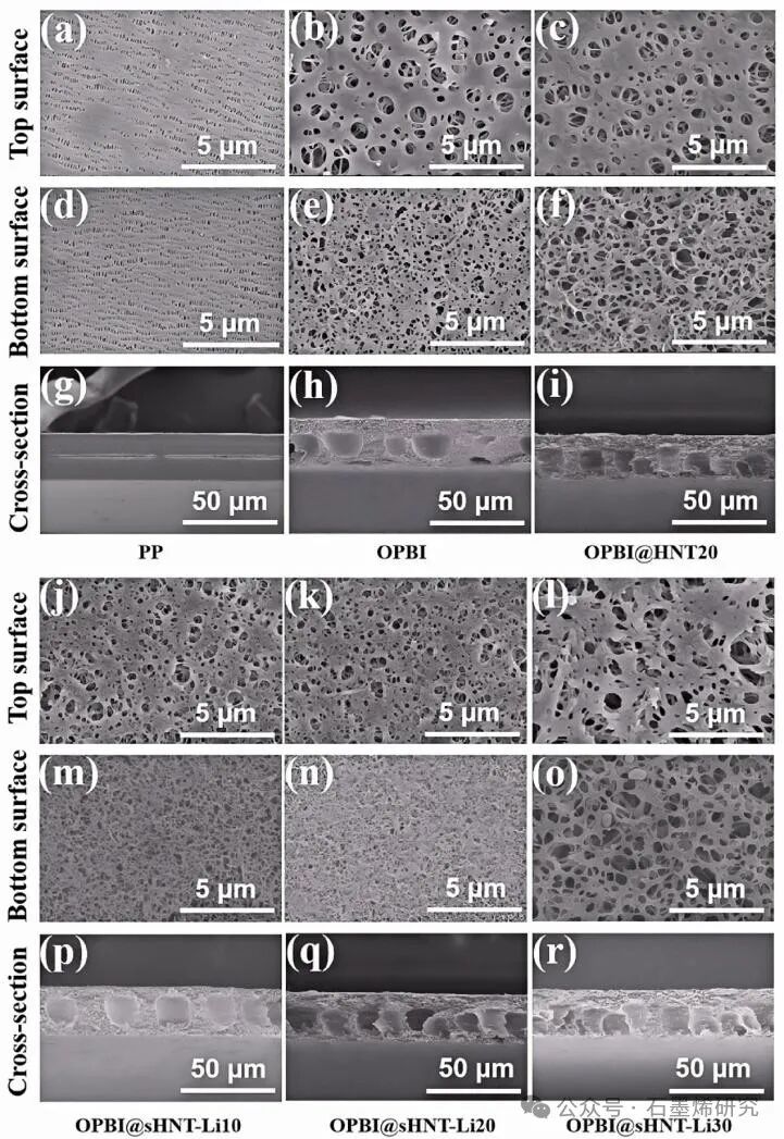 图3. 隔膜的 (a-c, j-l) 顶面、(d-f, m-o) 底面和 (g-i, p-r) 横截面的 SEM 图像。