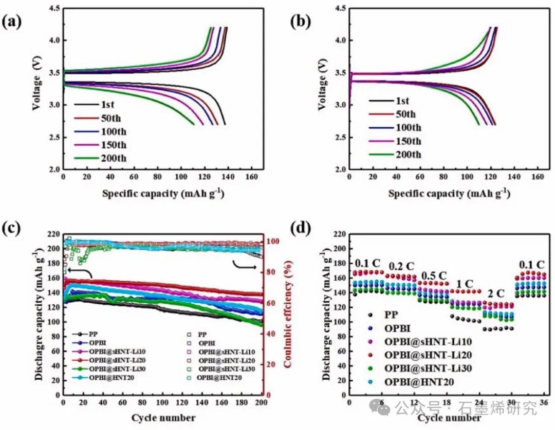 图 8. 使用 (a) PP 和 (b) OPBI@sHNT-Li20 隔膜组装的电池的充放电曲线;(c) LiPO4/Li 电池的循环性能和 (d) 倍率能力。