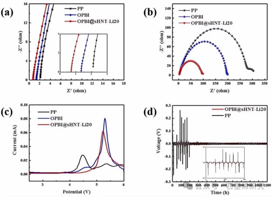 图 6. (a)隔膜夹在两块钢板之间组装的电池的交流阻抗;(b)夹在两个锂电极之间的对称电池隔膜的界面电阻;(c)隔膜夹在 LiFePO4 正极和钢板之间组装的电池的 LSV;(d)Li/隔膜/Li 的锂沉积/剥离循环稳定性。
