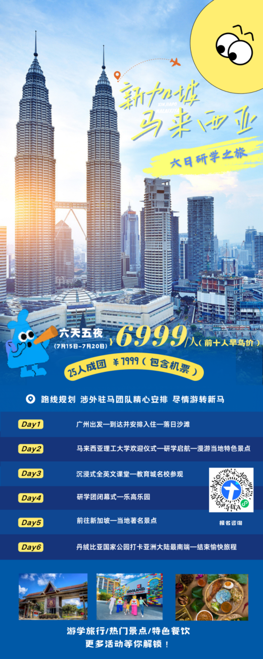 2024年暑假将至,跟随涉外 沉浸式体验不同国家的教育模式 了解东南亚新貌 全景式探索不同城市的多元文化 新马游学之旅,探索热带天堂的无限魅力!马来西亚是一个充满魅力的东南亚国家,以其多元文化和自然风光而著称。新加坡是一个多元文化的国家,华人、马来人和印度人等多个民族在这里和谐共处,各自的文化传统都得到了尊重和传承。马来西亚非常重视教育,国民普遍具备较高文化素质,更是海外唯一具备华文教育完整体系的国家。在这里,四季如夏,一年四季都适宜旅行,并且可以接触到不同种族、宗教和文化,体验前沿的教育文化,打开国际视野,激发无限潜能。 马来西亚理工大学(UTM)是马来西亚著名的国立大学之一。大学主校区位于马来西亚西马南端的柔佛州新山市。在2021年QS世界大学排名中位列第187位,2022年QS世界大学排名中位191,最新一期2024 年QS世界大学排名中位列第188位。除此之外,UTM连续多年被评为QS五星级大学。 简历写作研讨会 学习如何更有效地展示个人的学术成就、技能和经验,使简历更具吸引力。 肢体语言学习&TED听力训练 学习如何运用肢体语言增强个人的自信,提高沟通效果,在面试或演讲中留下更深刻的印象。TED演讲以其深刻的思想和出色的表达而闻名,通过听力训练,不仅可以提高英语水平,还能接触到各种前沿观点和思维方式,拓宽视野,激发灵感。 一对一模拟面试 提供一个真实的面试环境,帮助熟悉面试流程,增强自信,发现自己的不足并及时改进。一对一的形式使得面试过程更具针对性和实用性。 面试总结和指导 面试后的总结和反馈是提升面试技巧的关键。通过专业的指导和建议,可以深入了解自己在面试中的表现,找到改进的方向,为下一次面试做好更充分的准备。 分享环节 鼓励参与者交流经验和心得,有助于建立更广泛的社交网络,同时也可以通过倾听他人的分享,获得新的启发和灵感。 UTM入学申请流程指导 对于有意向申请UTM的学生来说,了解并熟悉入学申请流程至关重要。通过专业的指导,可以更加明确申请的要求和步骤,提高申请的成功率。 研学结束后,马来西亚理工大学(UTM)颁发官方英文研学证书升学背景有力证明。 ▲中国涉外教育集团代表团访问马来西亚 涉外教育代表团与马来西亚理工大学(UTM)院长合影,中国涉外教育集团投资公司(新加坡)黄耀全总经理、中国涉外教育集团投资公司(马来西亚)李海玲总经理出席 马来西亚游学之旅 Day1 7:00:新山士乃机场入境 9:00:入住--早午餐--休整 17:00:前往金海湾会所参加欢迎晚宴 19:00-20:30:沙滩落日/保龄球/KTV ▲沙滩落日 Day2 8:30:早餐 9:00-16:00:马来西亚理工大学(UTM)教育学院欢迎仪式--上课--午餐--下午campus tour 16:00:乘车前往市中心(陈旭年街--大皇宫--华族历史博物馆--印度庙--柔佛古庙--玻璃兴都庙) 19:00: 特色马来餐 ▲陈旭年街、大皇宫-、华族历史博物馆等景点 Day3 8:30:早餐 9:00-16:00:上课--午饭--上课 16:00-18:00:乘车前往新山莱佛士大学--大学城--雷丁大学及集团未来国际学院参观 18:30:回到住处自由活动(可游泳,逛街等。晚餐自理,可根据需求体验各色美食) ▲雷丁大学 Day4 8:30:早餐 9:00-11:30:上课 11:30-12:30:研学团闭幕式 12:30:午餐 13:30:乘车前往乐高水上乐园 18:30:中式自助 ▲乐高乐园 Day5 8:30:早餐 9:30:公共交通前往新加坡 12:00:午餐(自理) 13:00:新加坡空中花园-GARDEN BY THE BAY滨海湾花园(Floral Fantansy+Supertree Observatory+Flower Dome),鱼尾狮百年吊桥、和平纪念碑等等 20:00:返回新山 ▲鱼尾狮百年吊桥 Day6 8:30:早餐 9:30:前往丹戎比亚国家公园,打卡亚洲大陆最南端 12:00:午餐(告别餐安排在市中心) 13:00:自由活动(购物--整理行装--晚餐) 19:00:集合前往士乃国际机场返回广州 住宿&饮食 充满神秘与魅力的马来西亚不够吸引你? 别急!!! 还有充满异域文化气息的泰国等你解锁! 泰国游学之旅,一场与异域文化的邂逅!泰国历史悠久,有着深厚的文化底蕴,并且是我国的友好邻邦,两国山水相连,文化相通。华文教育在泰国落地生根,开花结果,发展蓬勃。泰国有着丰富的自然和人文资源,许多著名的景点吸引了无数游客前来观光。此外,泰国还以美食闻名于世界,每年都有大量的美食爱好者前来品尝当地特色菜肴。 泰国皇家理工大学,是直属泰国教育部的国立大学,是一所集高等教育和科学研究于一体的高水平、综合性理工大学。同时该校专业开设有纺织设计、化学工程、土木工程、电力工程、能源工程、机械工程、软件工程、物流管理、工商管理、设计教育、工程管理和创业学。是中国教育部涉外监管网的推荐高校,在该校获得的学历学位可以获得中国教育部的认证,可享受留学归国人员落户、免税购车等优惠政策。 泰语与英语速成教学课程 帮助学生快速掌握这两种语言的基础技能。泰语课程使学生能够在短期内掌握泰语的语音拼读规则,了解泰语的历史和文化背景,为以后在泰国学习、生活或工作提供便利。英语课程则注重提升学生的语言自信,通过实践和交流,让学生在真实的语境中运用英语,从而更快地提高英语水平。 国际学生交流 能够极大地拓宽学生的视野。通过与国际学生的交流,学生可以深入了解不同文化背景下的思维方式和价值观念,增强跨文化交流能力。这种跨文化的体验有助于学生培养全球化的视野,为他们未来在全球化的社会中发展打下坚实基础。 ▲中