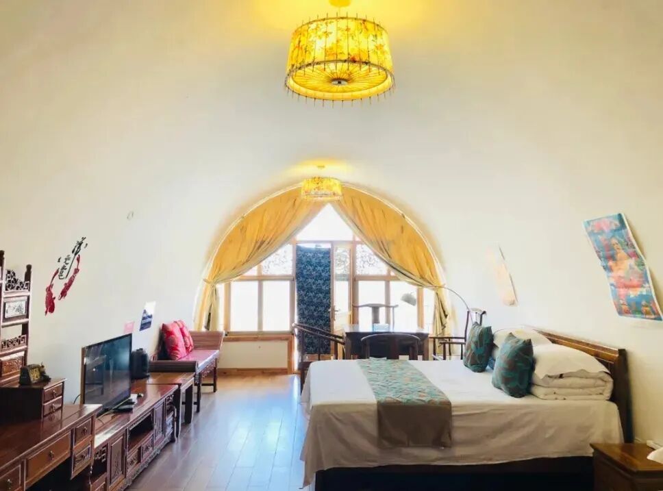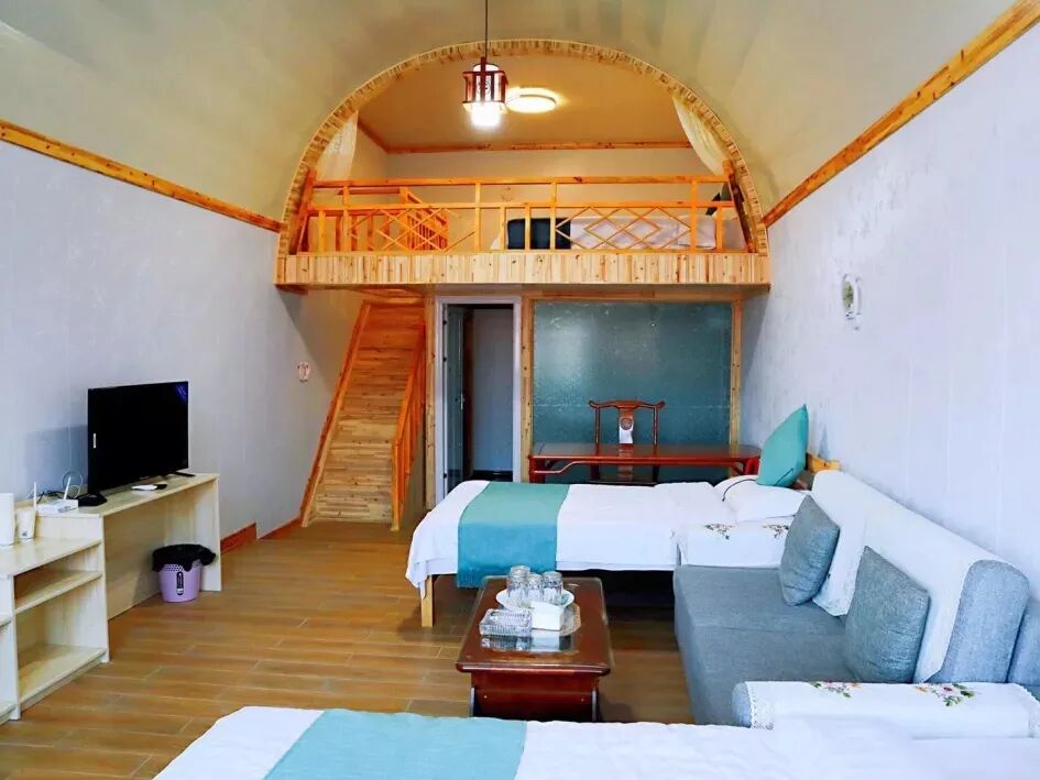 众所周知,窑洞是黄土高原的传统民居形式,冬暖夏凉,复式套房总共7间客房、面积61.32㎡/间、床型:4张1.2米、总共可住28人。圆弧型的外观使其在厚重的黄土坡上显得轻巧可爱,内里的拱顶使整个空间拉高,显得室内宽阔敞亮.