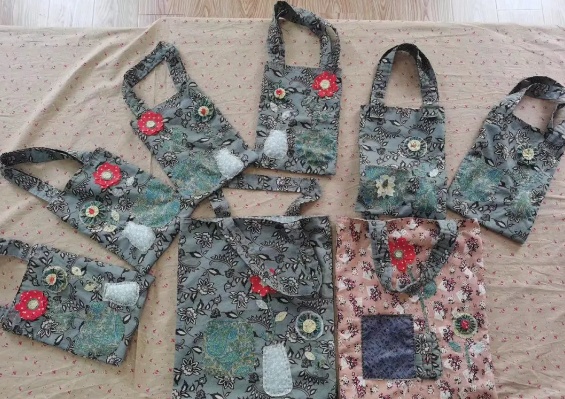一块块色彩丰富的印花棉布,搭配上五颜六色的绣花线,心灵手巧的姐妹们通过构图设计、穿针引线,做好了一个个鲜花盛开的环保手提包。每一朵鲜花、每一个叶子,都是不一样的造型和颜色,这是姐妹们对春天独特的理解和热爱。