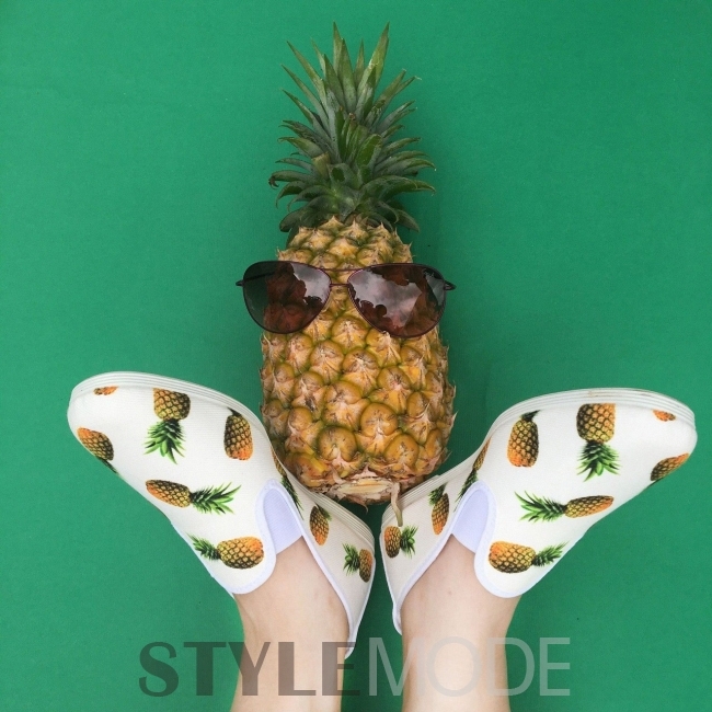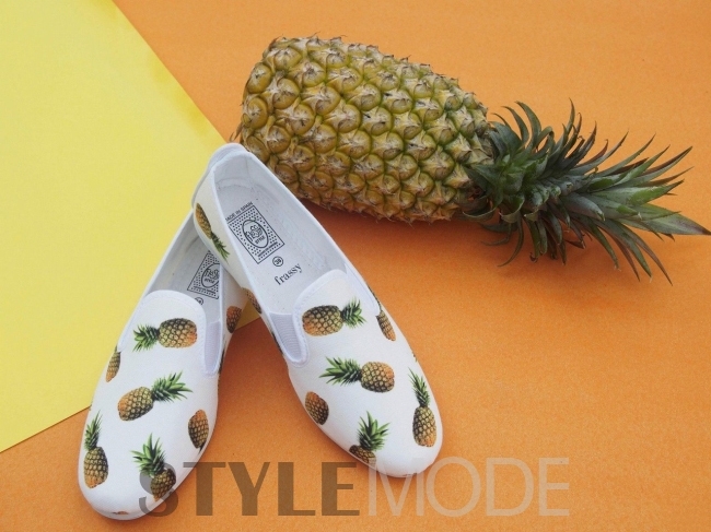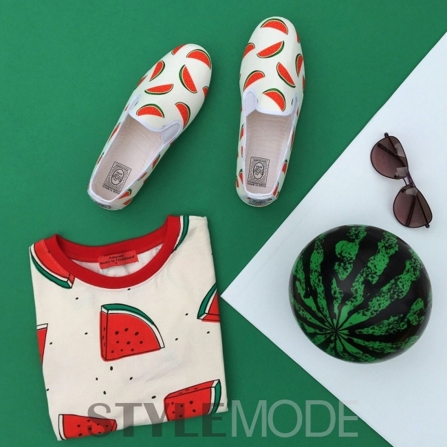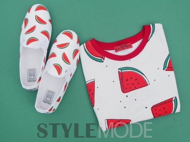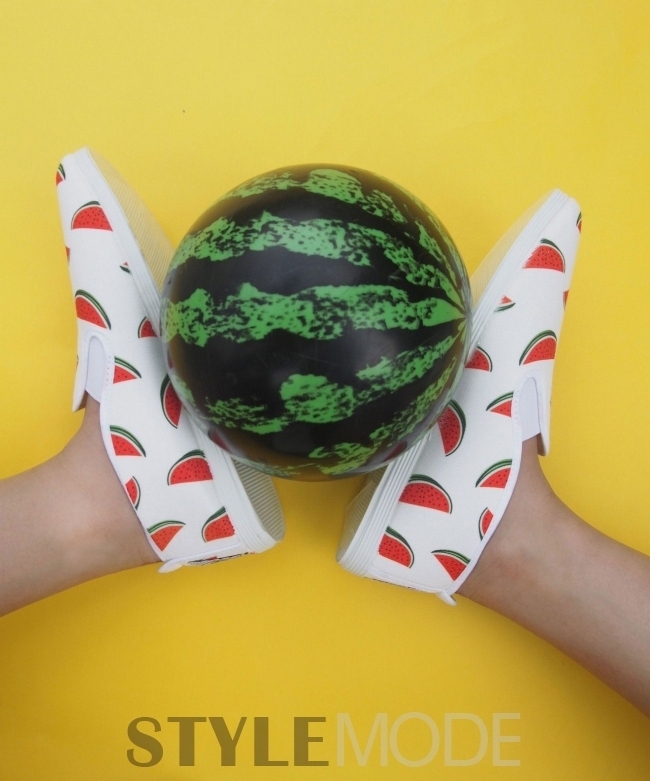 袭卷巴塞罗那海滩的西班牙品牌Flossy,遂将鲜艳的红绿西瓜放上全白的鞋面,或以经典的热带水果、及人人都想舔一口的冰淇淋。