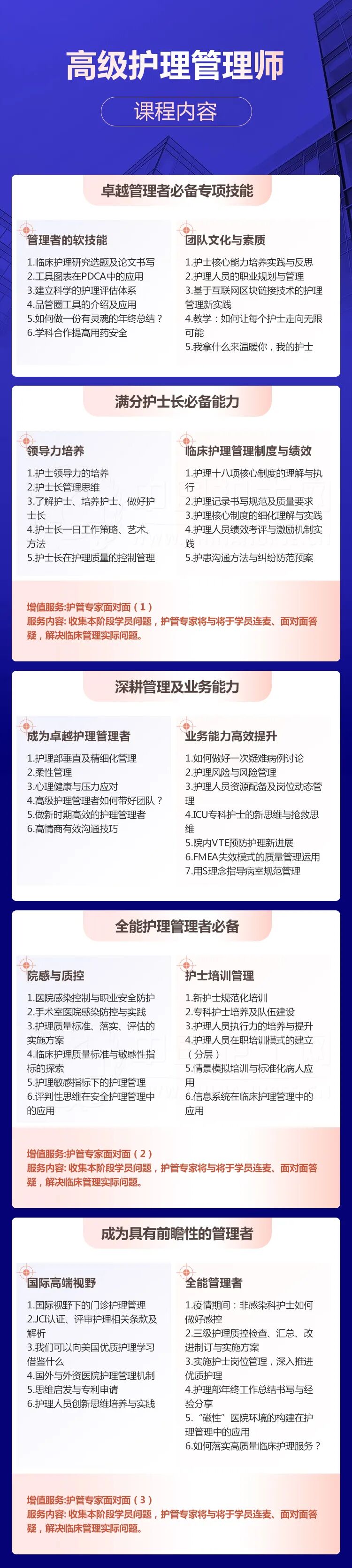 责任护士十知道 具体内容 举例 来源:纳洛酮的护理天地 如何成为一名令上下级都满意 能力超强的 优秀护理管理者? 提升沟通能力、管理能力、 领导力、影响力…… 高级护理管理师 教会你洞察,全方位深入的了解护士,掌握管理思维;解构管理框架,学习别的优秀护士长护理部主任如何做管理;还有进阶的专项学习,补全短板,提升专业能力、扩宽你的管理思路和视野! 扫码立即报名 胜任岗位、征服人心 管理能力高效提升 ??新班正在招生?? 护理管理 作为临床护理工作者必学的一项护理管理专项课程,内容涵盖全面系统,适用于各科室,如品管圈、JCI、门诊管理、垂直管理,高端医院护理管理、院感控制、质控管理,护理文书、护理表格,分层管理、情景模拟,新护士培训、高情商的沟通等。 详细拆解学习 如何做好护士长、如何竞聘护士长,你考虑不到的细节,都一一覆盖!扎实的护理管理知识储备,不仅能为你职场加分,对你能力的提升有显著效果。 护士、护士长、护理部主任 大咖讲师+精品视频课程+直播课程+答疑互动+护理专家面对面+各类型专项技能讲座=成就全能管理人! 学习国内外的管理和护理管理最前沿的模式和方法 学习和解决临床护士长和护理部主任需要的能力和解决难题的方法 为自己的职业晋升和职业岗位变动储备和积累资质和能力 快速提升岗位胜任力、有效解决管理短板、提高写作/表达/解决问题能力! 高级护理管理师,帮你打通管理思路,等于有一个随时可以解决护理管理问题的咨询专家团队,解决管理短板、提高解决问题能力、提升管理能力。![]()