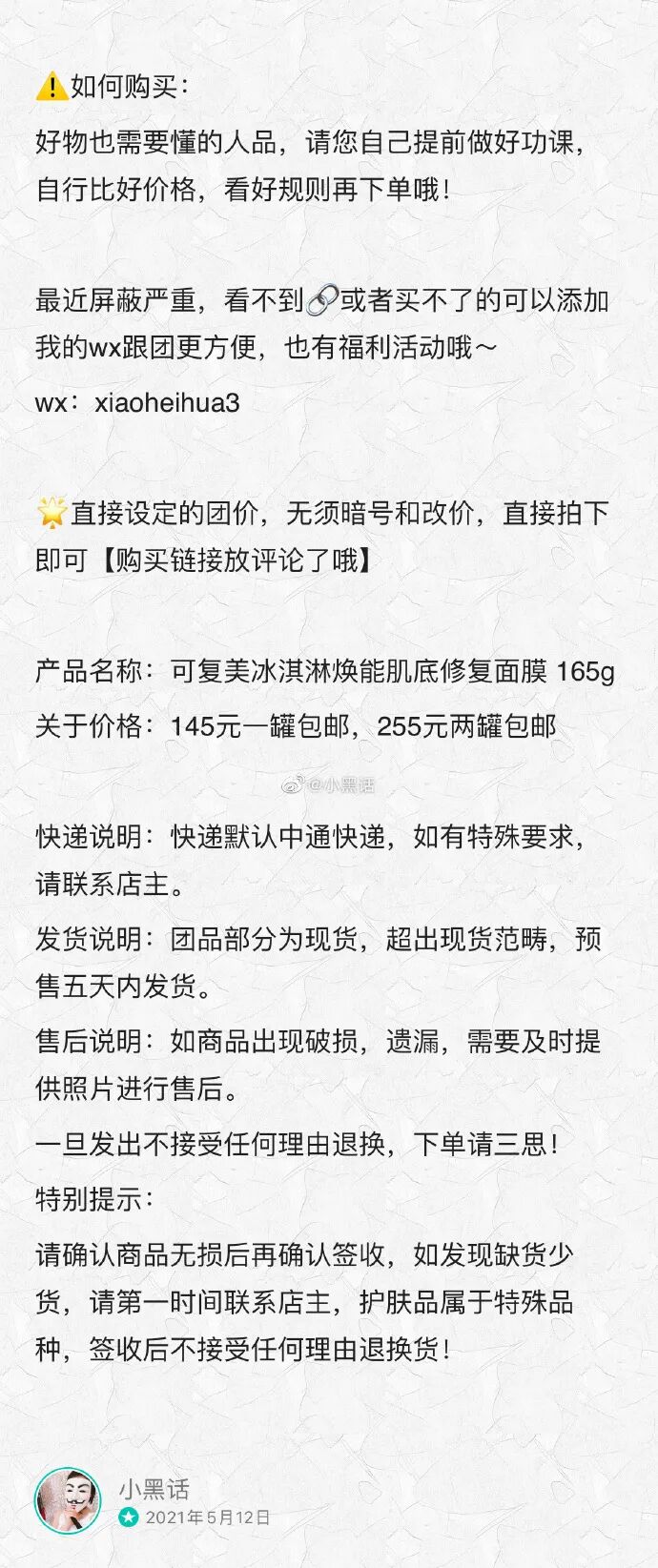 可复美这个品牌已经很扛得住口碑了,加上它出新品的速度真的很慢,一旦出了妥妥买就是,绝不会差~这个夏天一定要人手必备一罐 爽歪歪~ !谁用都说好!168g一大罐。![]()