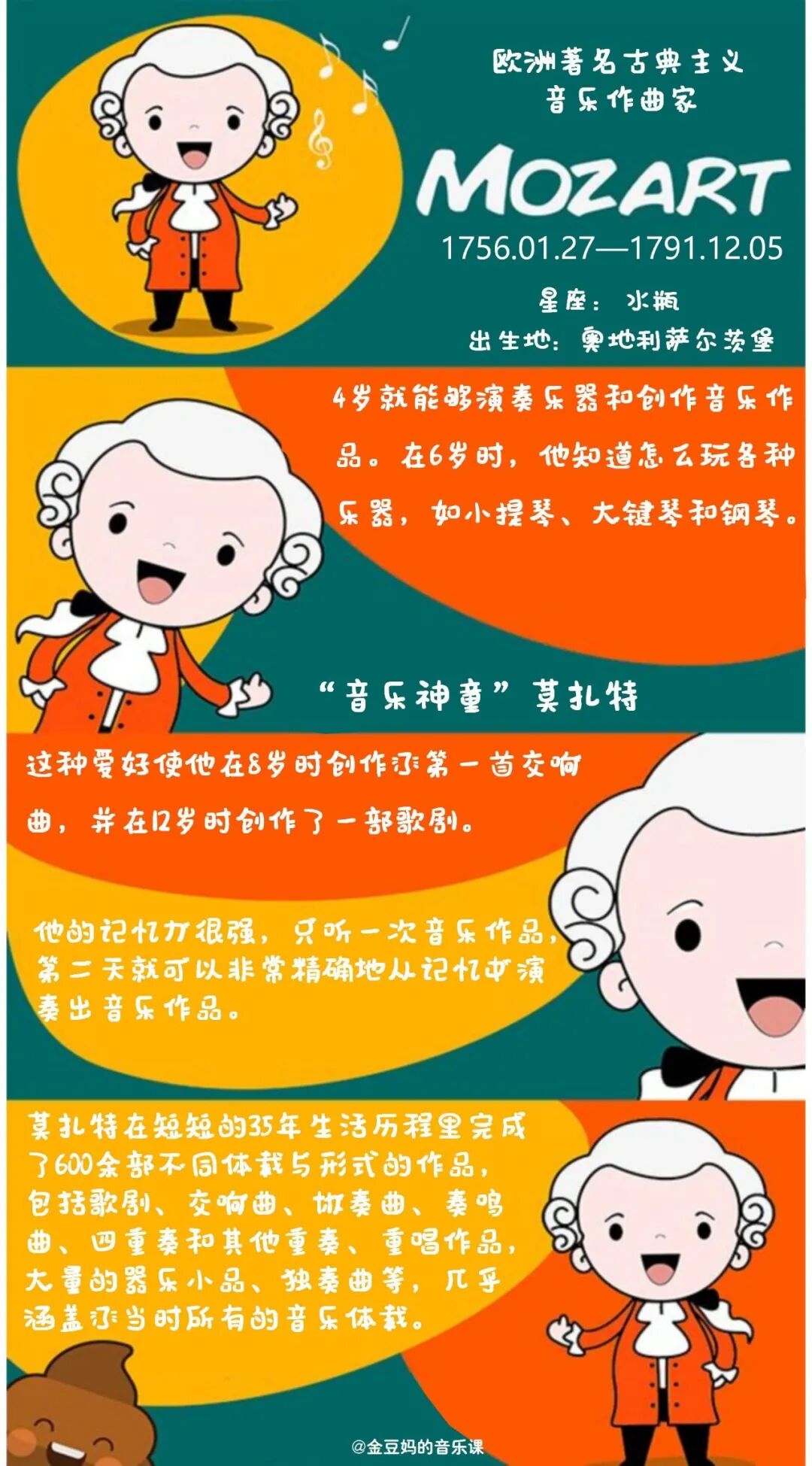 如果说起古典音乐家,我想很爸爸妈妈们一定会马上想到莫扎特,很多妈妈们在怀着宝宝的时候也一定选择过莫扎特的音乐作为胎教音乐。金豆妈也不例外,在金豆小时候就经常给金豆播放《小星星变奏曲》、《土耳其进行曲》等音乐。