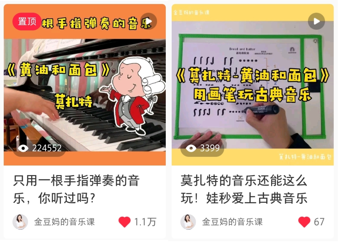 金豆妈在之前分享的《古典音乐图谱》游戏中,我选择过莫扎特的音乐制作成图谱游戏,小朋友们都非常的喜欢。在小红书视频号里,我也分享过我弹奏的莫扎特《黄油和面包》这首音乐作品,已经有22万次的播放,并获得了1.1万次的点赞,这足以看出莫扎特的音乐是非常受到大家的喜爱的。