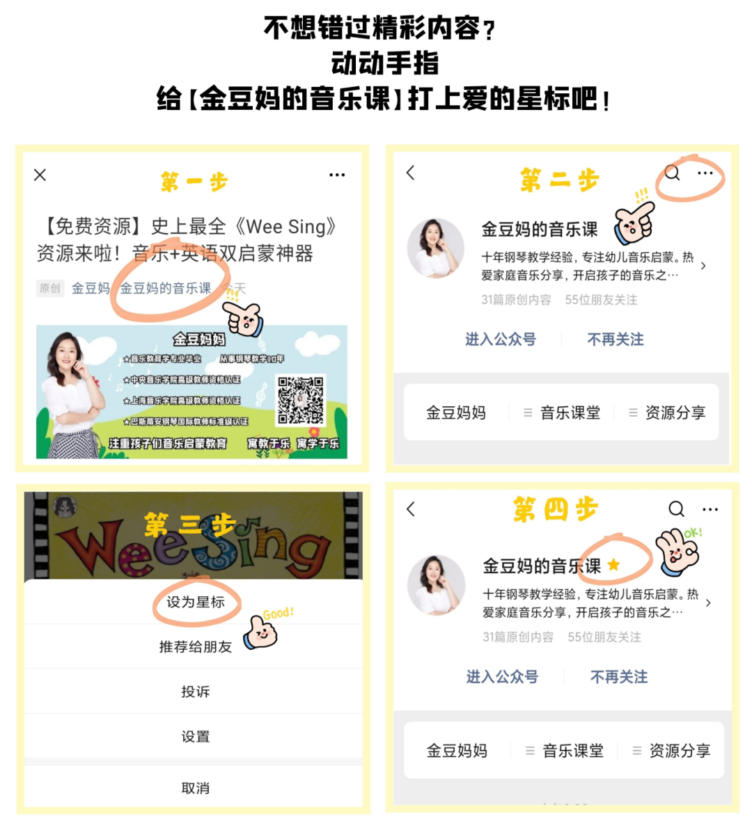 因微信推送机制改版,为了不跟金豆妈失联,大家可以给金豆妈的音乐课公众号设置“星标”,或者看完文章后点亮底部的“点赞或在看”,如果你喜欢金豆妈的内容,还请多多分享至朋友圈,让更多的爸爸妈妈们可以发现金豆妈,让更多的孩子可以喜欢上音乐。