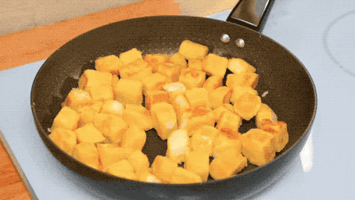 4. 热锅冷油,馒头丁倒入锅中翻炒,加入孜然粉,翻炒至变色即可