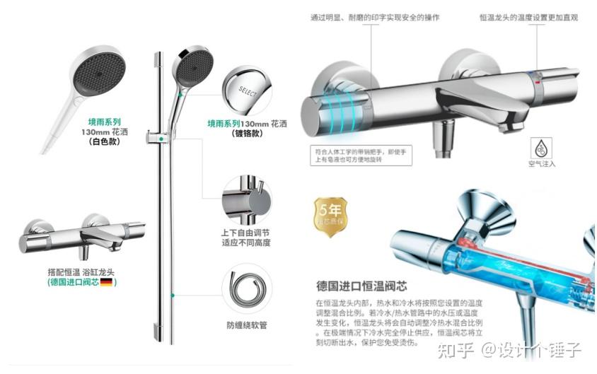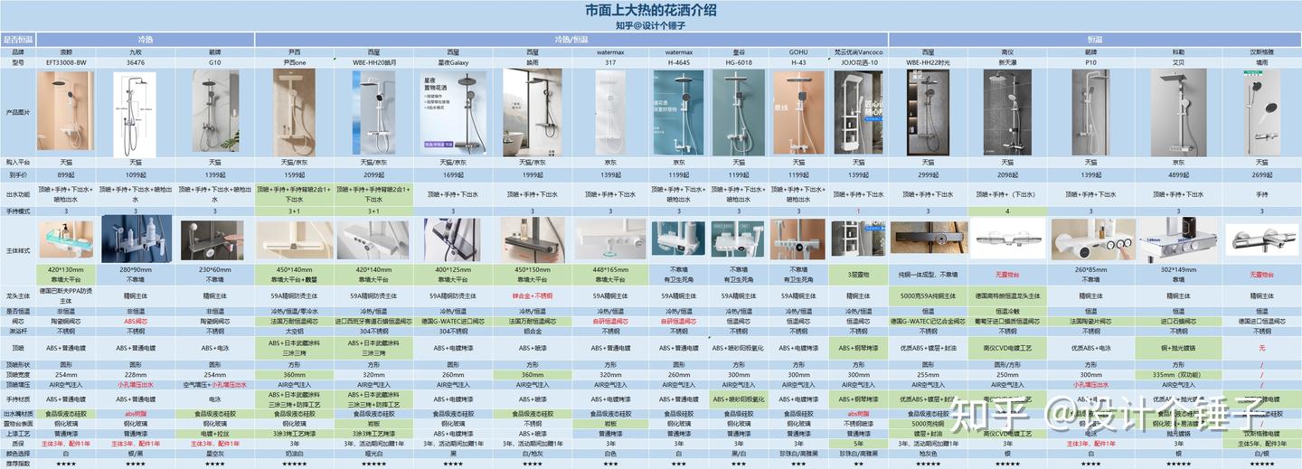 更新于2023.7。本篇讲讲我最擅长的花洒! 大家好,先做个自我介绍。我是@设计个锤子,2023年在卫浴行业打工10年,一直做的是智能马桶和恒温花洒的研发工作。大学是产品设计专业,另找出路也挺难,在卫浴这个枯燥行业,不知不觉竟然做了10年。请大家相信我的专业性! 来!2023.7推荐最新2款! 国产之光!和新品牌谈了合作:点击链接找客服,报暗号“#设计个锤子”可领大额优惠券 7月更新!尹西上新款【Halo花洒】 奶油白简约花洒,颜值很绝!净水过滤设计,99%除氯,对皮肤和毛囊更友好,远离掉发、长痘。双功能顶喷很解压,空气增压技术,体验感一流,年轻家庭非常建议入手! 性价比高,点击链接找客服,报暗号“#设计个锤子”可领优惠!马桶花洒浴室柜龙头都有 大品牌新品!最近新出的西屋唤雨很好看,而且性价比很高!带了增压功能,水压低的家庭速看! 性价比高,点击链接找客服,报暗号“#设计个锤子”可领优惠!马桶花洒浴室柜龙头都有 因为工作中要不时对比各大品牌竞品的新花样,对市面上的大热花洒都有研究,不少款式我还可以公费购入试用,家里经常就是一堆花洒,天天试用+测评,洗澡都洗到快到快掉皮了,干脆就给你们来篇【花洒选购推荐】吧,也算是给我的测评做个记录。(为了不让自家领导发现,本篇就没带公司的品牌玩!你们可以猜猜我做啥品牌哈哈哈) 目前已经写过好几篇关于卫浴家装指南、马桶选购、恒温花洒选购的文章(要看的自己去翻翻哈!)为大家在这方面的选购提出了很多不错的建议;同时我已经回答过超200条关于卫浴产品选购方面的问题,消费者给我的反馈也想相当不错,所以在专业性上还是值得大家信赖的。 装修完毕之后花洒要怎么选?今天就让我这个卫浴打工仔告诉你吧。 觉得本文对你有帮助可以就给小锤一个关注和点赞,感激! 卖个关子:花洒选不好会怎么样?不就一个蓬蓬头?如果你这样想就真的大错特错了!劣质花洒会漏水、掉漆、烫手、还有水垢水渍,不美观还有安全隐患! 今天@设计个锤子 就给大家说说花洒选购的技巧,给大家推荐几个还不错的款式,抄作业的那几款,都是我用过的认为很不错的花洒。更多的网红款式也在文末给大家列举了,但是丑话说在开头,结尾的那几个网红款我不大推荐。 比较推荐的国内品牌:尹西、箭牌、浪鲸 比较推荐的国外品牌:汉斯格雅、西屋、高仪 看中的款式不妨先加购,还是智能马桶那句,本文会得罪一部分的品牌,且看且珍惜。 觉得本文对你们有帮助的不妨给锤子一个点赞、收藏、转发、评论,让我有动力写更多卫浴产品的推荐文章。锤子在此谢过各位! 本文整理了十几款市面上大热的花洒,“表哥”先给你奉献出来了!时间足够可以慢慢对比看看: 更多花洒选购的技巧或者安装问题都可以来问我,只要看到我就会回复你的!!! 如果你想直接选购花洒,那可以直接从下面几款中选购,恒温和非恒温都给你推荐了,如果懒得看可以在评论区或者私信提问,我看到的第一时间就会回复。 尹西Halo 奶油白花洒【活动价:1299起】/冷热款【999起】 性价比高,点击链接找客服,报暗号“#设计个锤子”可领优惠!马桶花洒浴室柜龙头都有 这款的颜值很不错,简约精致。纳米疏水置物台,不留水垢,能收纳的东西也很多。恒温阀芯采用的是进口法国万耐,耐用度很高。最特别的是他的顶喷功能,有双模式出水功能,体验感很好,很解压。推荐年轻家庭、奶油风装修家庭购入! 尹西one奶油白【上新价:1399起】 点击链接找客服,报暗号“#设计个锤子”可领大额优惠券 日常1499元起,有条件推荐一步到位,购买顶配恒温0冷水款1799。远程预排冷水,家中无需安装零冷水热水器;治愈系奶油白色;大顶喷、大置物台;液晶温度数显;手持喷枪二合一设计;优质恒温阀芯...外观和功能都是吊打国内同价位的网红品牌的。非常推荐购入! 顺便说一句: 618上新!尹西新款奶白花洒,这次千元以内就能入手了,这么平价的奶白花洒全网都很难找到了 而且这款还有净水功能,想了解的小伙伴可以来看这篇: 点击链接找客服,报暗号“#设计个锤子”可领大额优惠券,到手价899起! 汉斯格雅镜雨白色花洒【活动价2699起】 汉斯格雅是花洒中的佼佼者应该都知道吧。除了贵没毛病!这款只有手持的恒温花洒,如果对其他功能要求不高还是很推荐购入的,品质就摆着这里,而且是进口的德国阀芯,质保5年,用到的是汉斯格雅引以为傲的电镀技术,买一个可能15年都不用换。体验感真的和雨淋一样! 箭牌G10星空灰花洒【活动价:1399起】 这款四功能花洒是有三色可选的,但是银色和黑色都容易留水垢,推荐你买枪灰色,会贵一点。没有封油,后续也会有淡淡的水渍,但是对比黑色要好很多。调温那里的设计个人觉得一般般。有空气增压,但是还是用到小孔增压,有轻微刺痛感,其余各方面表现中规中矩,性价比也可以。 以下为正文: 现在市面上的多功能花洒,从几百到上万都有,到底怎么选才可以选到自己喜欢,用着省心的花洒呢?有时间的就往下慢慢看。 恒温和冷热肯定是现在选花洒最大的区分点,舒适度上,恒温肯定是首选,简单地说,恒温花洒就不会有洗澡忽冷忽热的烦恼,用过恒温的就不会再想要用普通冷热的了,当然,恒温的相对也会比较贵。 恒温和冷热肯定是现在选花洒最大的区分点,舒适度上,恒温肯定是首选,简单地说,恒温花洒就不会有洗澡忽冷忽热的烦恼,用过恒温的