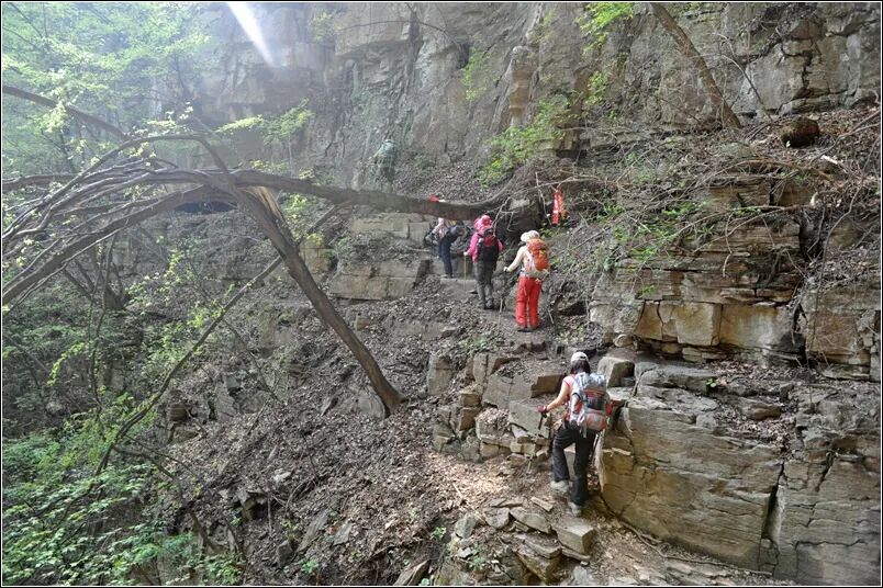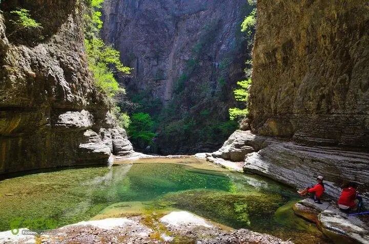 早上集合出发中午到马武寨,午餐后徒步约4个小时穿越抱犊沟、一线天,顺流而行。走进这条大峡谷,就感到了一股不同的气势,它绝不同于普通的峡谷,自然风光秀丽,原始气息浓郁,湖光山色倒映,河道两侧绝壁如削、怪石峥嵘、造型奇特;河床底部三步一泉,五步一溪,十步一潭,清泉流淌,喷珠溅玉,时而急湍而下,时而微流细浪,时而平静如湖。驴友至此犹如坠入世外桃源,给人以“长恨严冬无觅处,不觉转入此间来”的诗情画意。晚上抵达抱犊村休整。