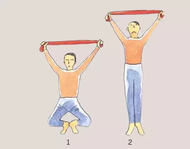 1.双手紧握毛巾,双腕向上举起,并伸直上身。